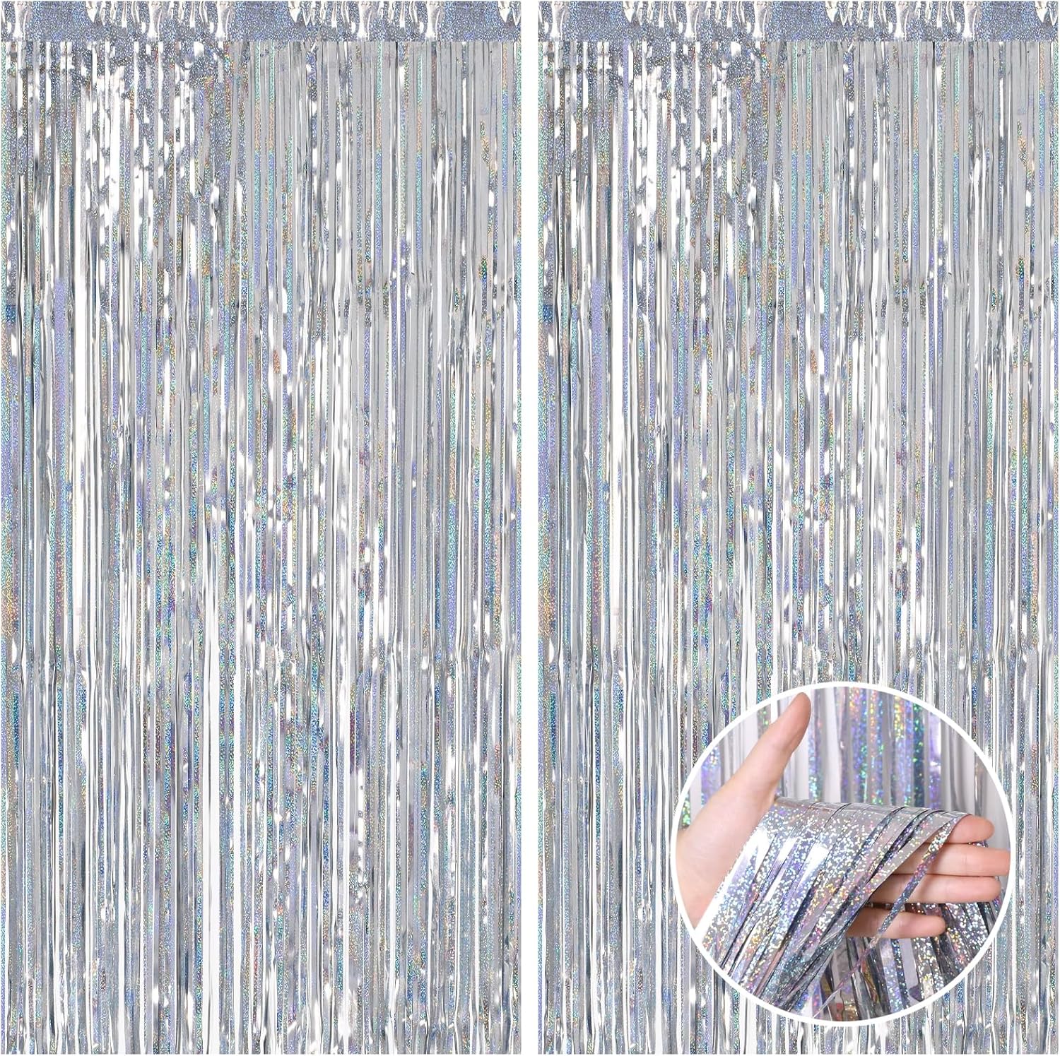 CANREVEL 2 Pack 3.3x8.2 Feet Laser Silver Foil Fringe Backdrop Curtains, Tinsel Streamers Birthday Party Decorations, Fringe Backdrop for Graduation, Baby Shower, Happy New Year, Disco Party