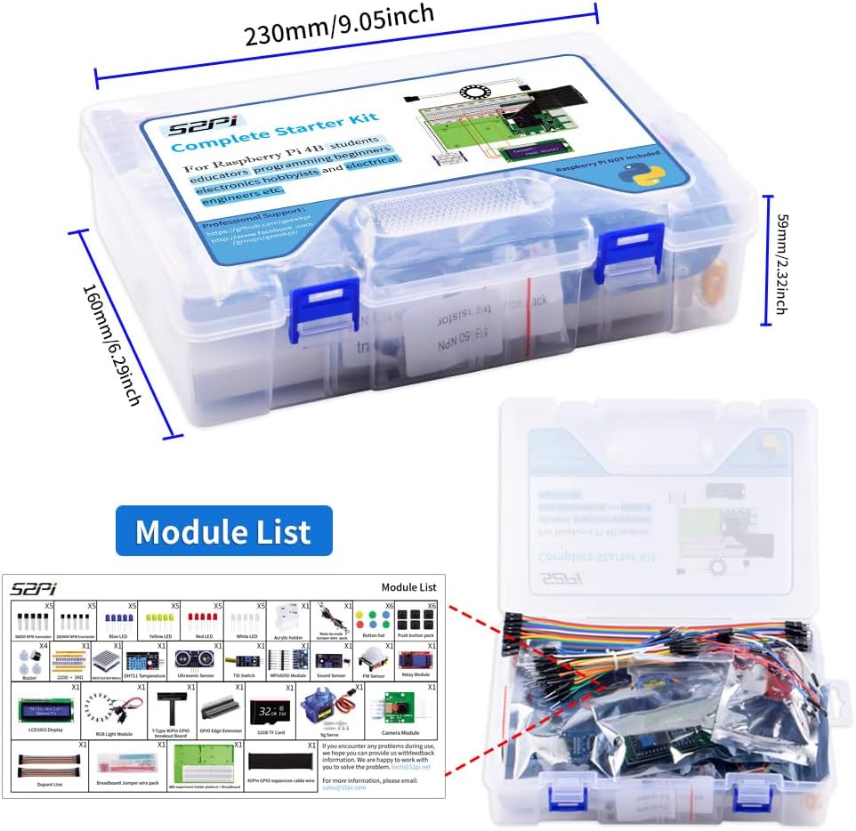 • Includes Various Components --- Contains a MPU6050 module, 1-channel relay, tilt sensor, sound sensor, T-type GPIO expansion board, GPIO edge expansion board, ultrasonic sensor, DHT11 temperature and humidity sensor, LCD1602 display module, PIR sensor, servo motor, 830 point solderless breadboard, 40pin jump wires, WS2812 RGB light ring, ABS Breadboard Holder, 500W camera, R/G/B LED lights, MAX7219 8x8 matrix, S8050 and 2N9304 NPN transistors, 220 ohms and 1k ohm resistors.