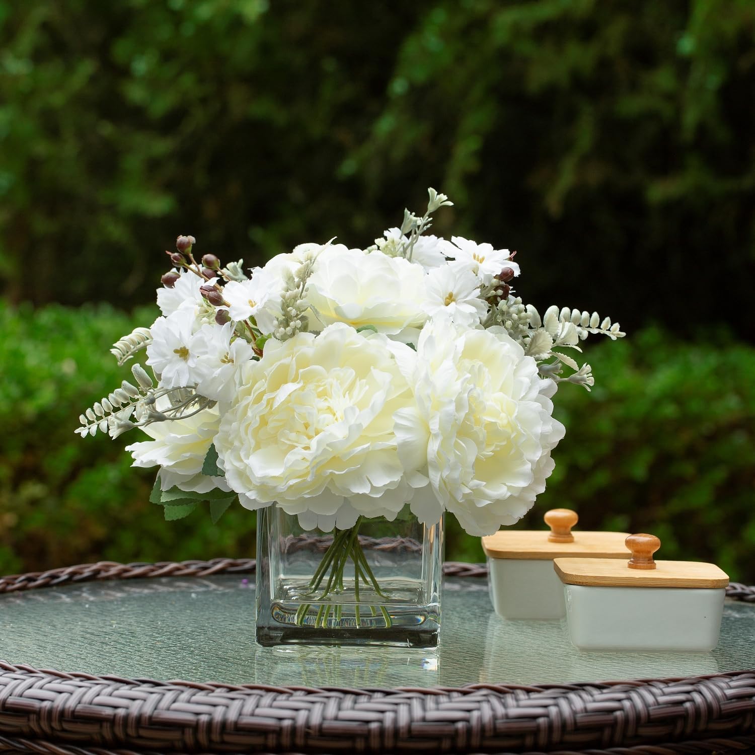 • 【Unique Designs】Each bouquet arrangement is handcrafted. The faux Peony is made of high-grade silk, the fake flower stem is wrapped in plastic wire, the clear glass block vase is crafted with thick glass and a stable bottom to ensure durability, and the acrylic faux water can firmly combine the fake flowers and the clear glass vase. The realistic foliage, soft stems, and handcrafted blooms give an everlasting refreshing look and feel to your floral arrangements.