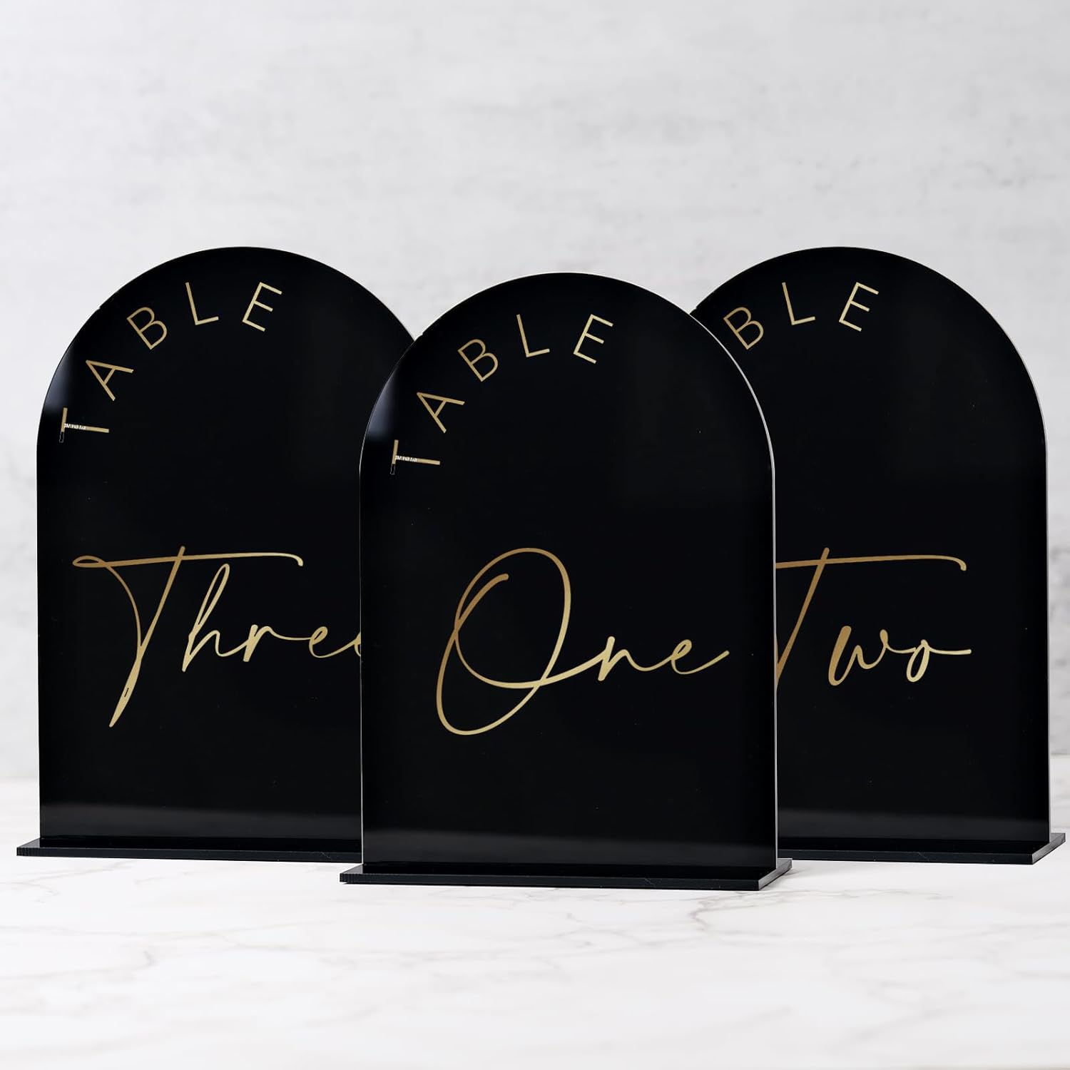 • PREMIUM QUALITY: These arch table numbers black and gold with stands are made from high quality black acrylic panels and then printed with gold letters in a simple arch design that won't go out of style and will last a long time.