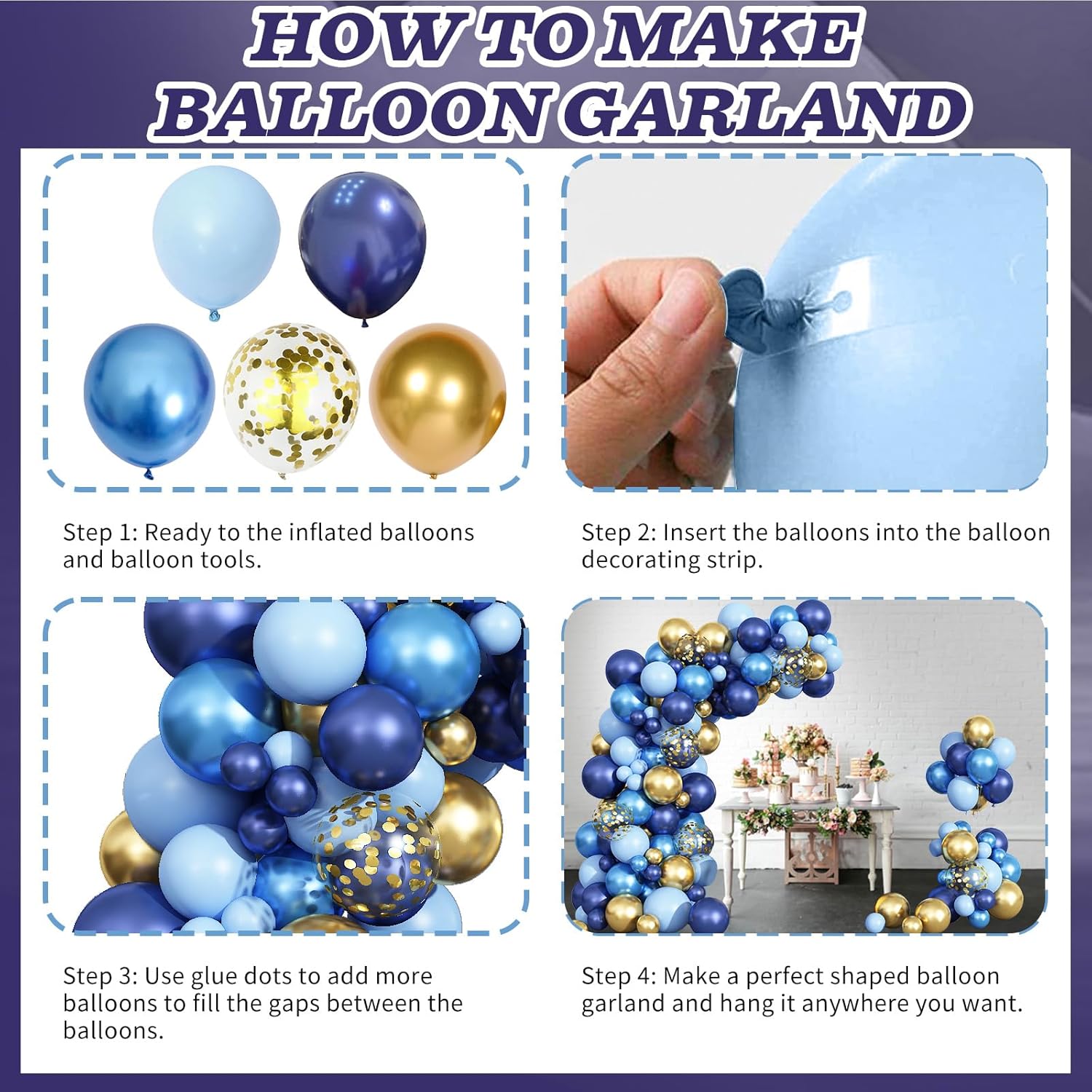 • 🎈What You Get - Blue Gold Balloon Garland Arch Kit, package including 16pcs 12 inches balloons(macaron blue*10, gold confetti*10), 51pcs 10 inches balloons(macaron blue*10, metallic gold*6, pearl navy blue*20, metallic blue*15), 38pcs 5 inches balloons(macaron blue*10, metallic gold*8, pearl navy blue*10, metallic blue*10), 1pc balloon strip, 1pc dot glue. All in one value package! They are ideal for adding an extra dose of fun to any entertaining party.