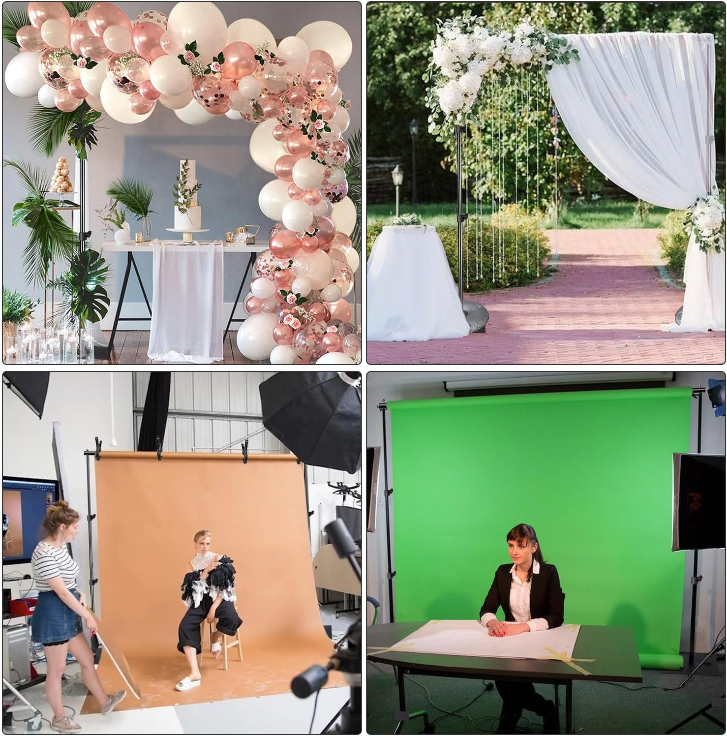 • Pipe and drape backdrop kit This one can hang curtains, balloons, string lights, flower walls and grass walls and other decorations. Use for family gatherings, baby shower,business events,weddings and professional photography or parties.