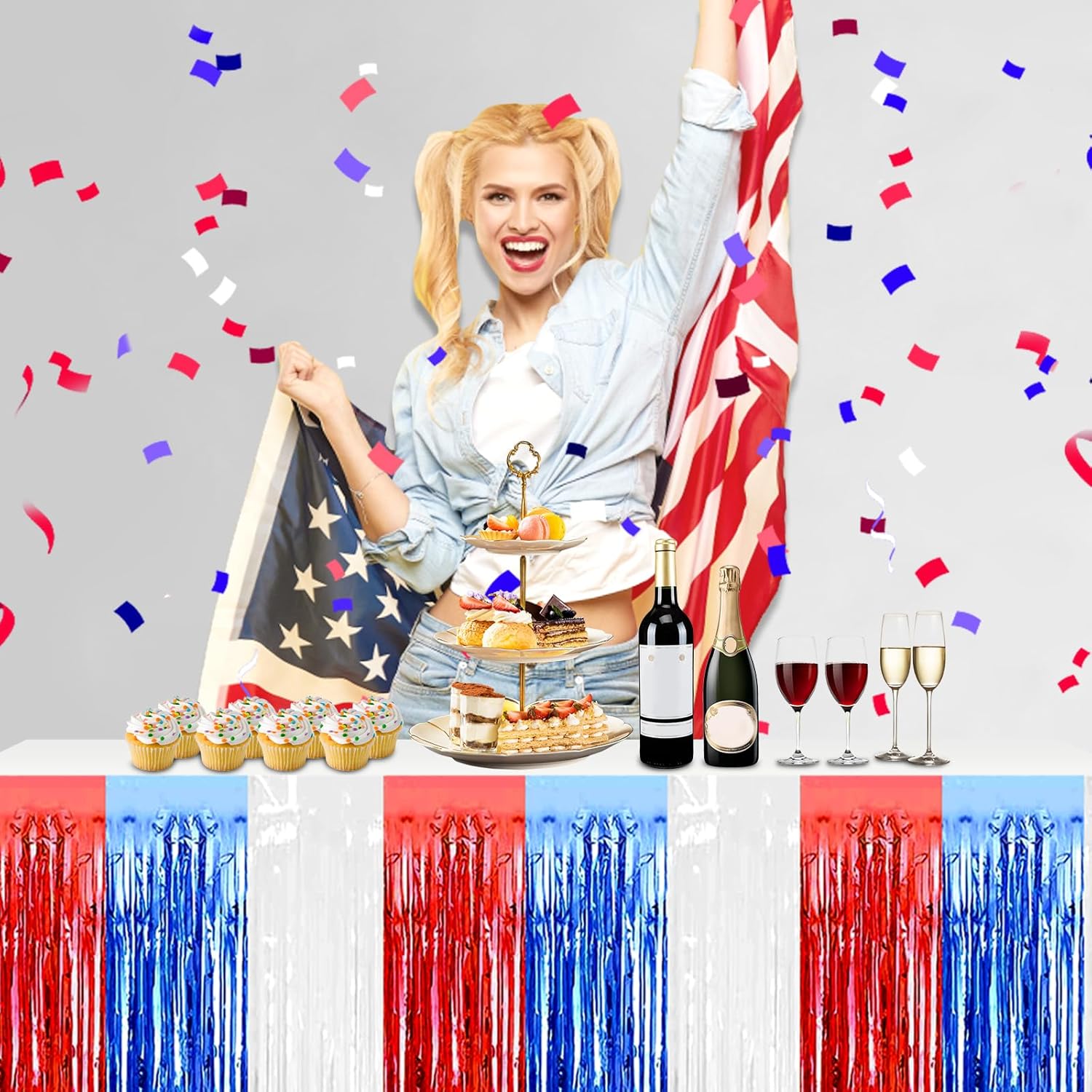 3 Pack 29x108 Inch White Blue Red Foil Fringe Table Skirts Metallic Banner for Tinsel Streamer Garland Backdrop for Parade Floats Wedding Thanksgiving Birthday Christmas Halloween Party Decoration