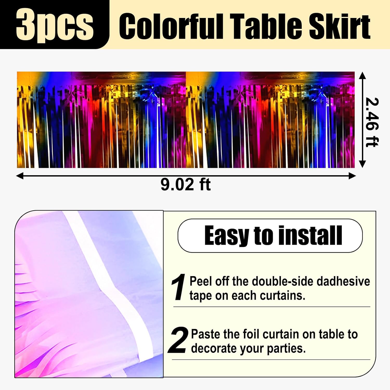 • Specifications and dimensions:3 Packs metallic foil tassel table skirt 29x108 inches, which is enough to decorate your party, provide you with excellent Convenient installation: the table skirt is equipped with self-adhesive tape. Just tear off the tape and paste it. The installation is convenient and quick. It can be pasted on the edge of your round table and square table. It can be easily cut into any siz.