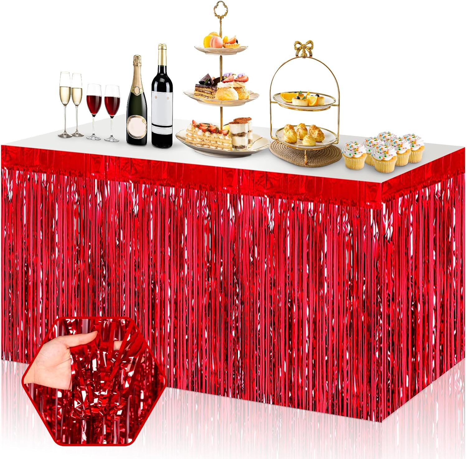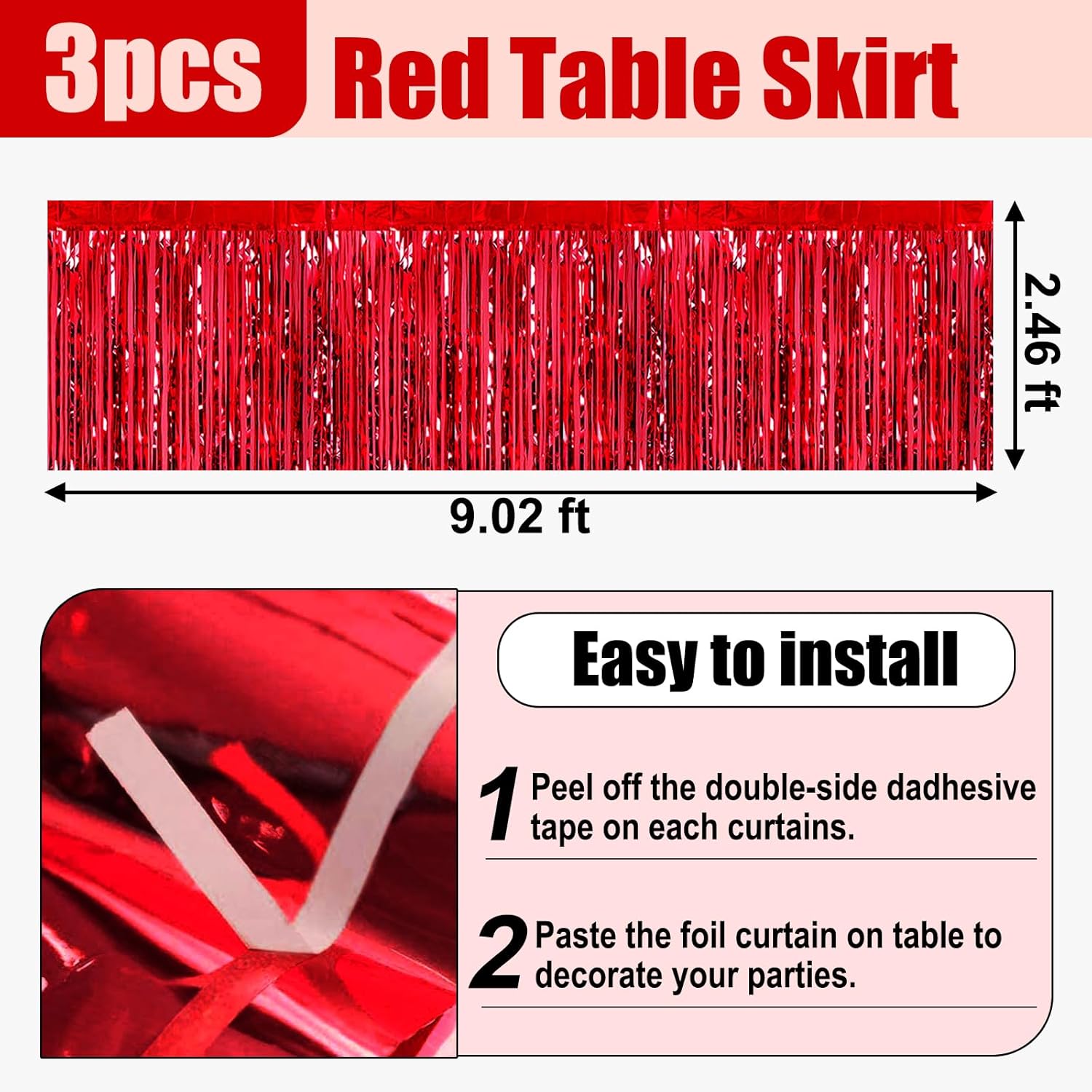 3 Pack 29x108 Inch Red Foil Fringe Table Skirts Metallic Banner for Tinsel Streamer Garland Backdrop for Parade Floats Wedding Thanksgiving Birthday Christmas Halloween Party Decoration