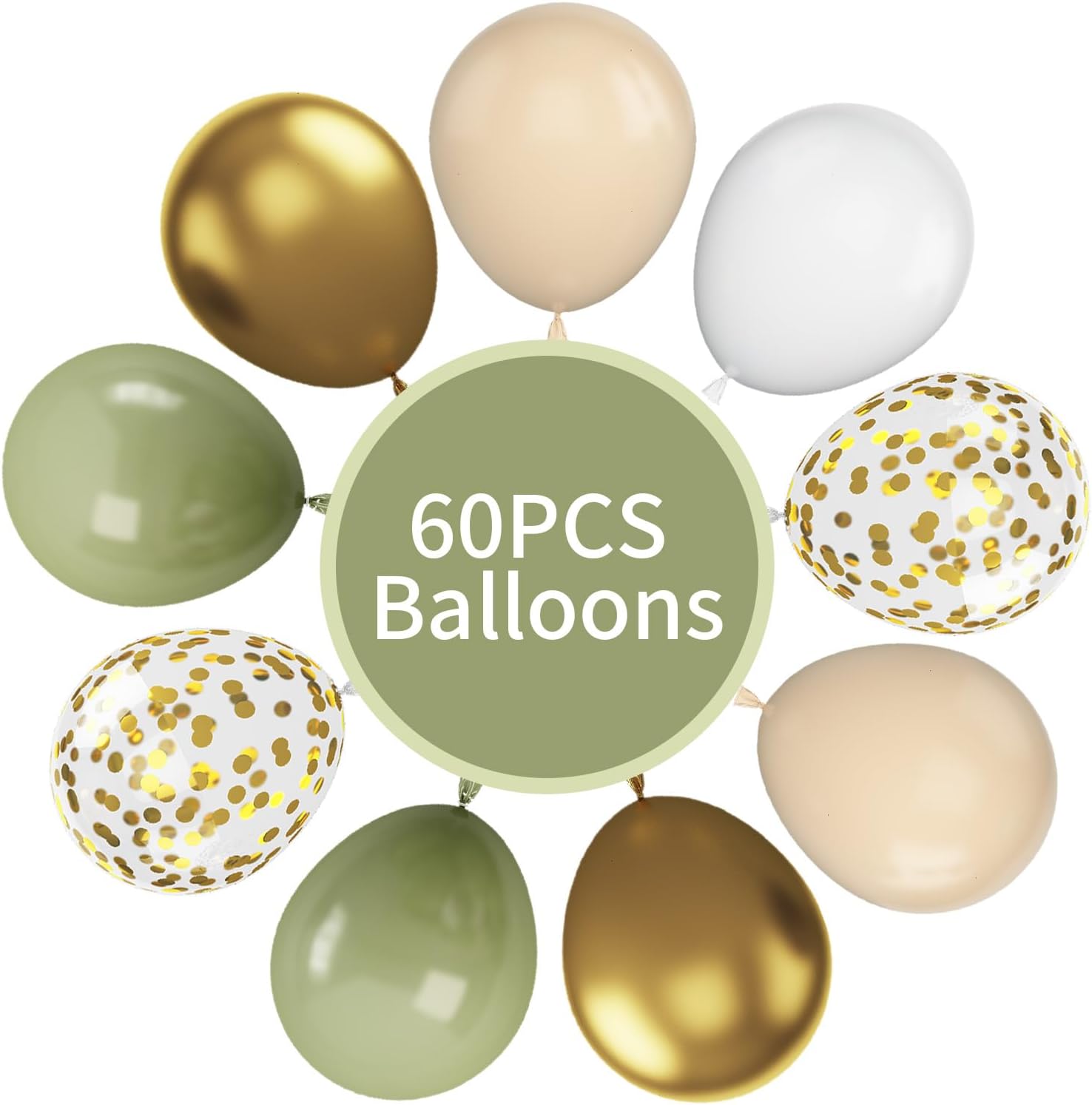 • Package Included : Our sage green balloons set includes 60 pcs 12 inch latex balloons. 23 pcs sage green balloons, 22 pcs white balloons, 6 pcs gold balloons, 4 pcs apricot+white double balloons, 5 pcs gold confetti balloons and 2 pcs white ribbons