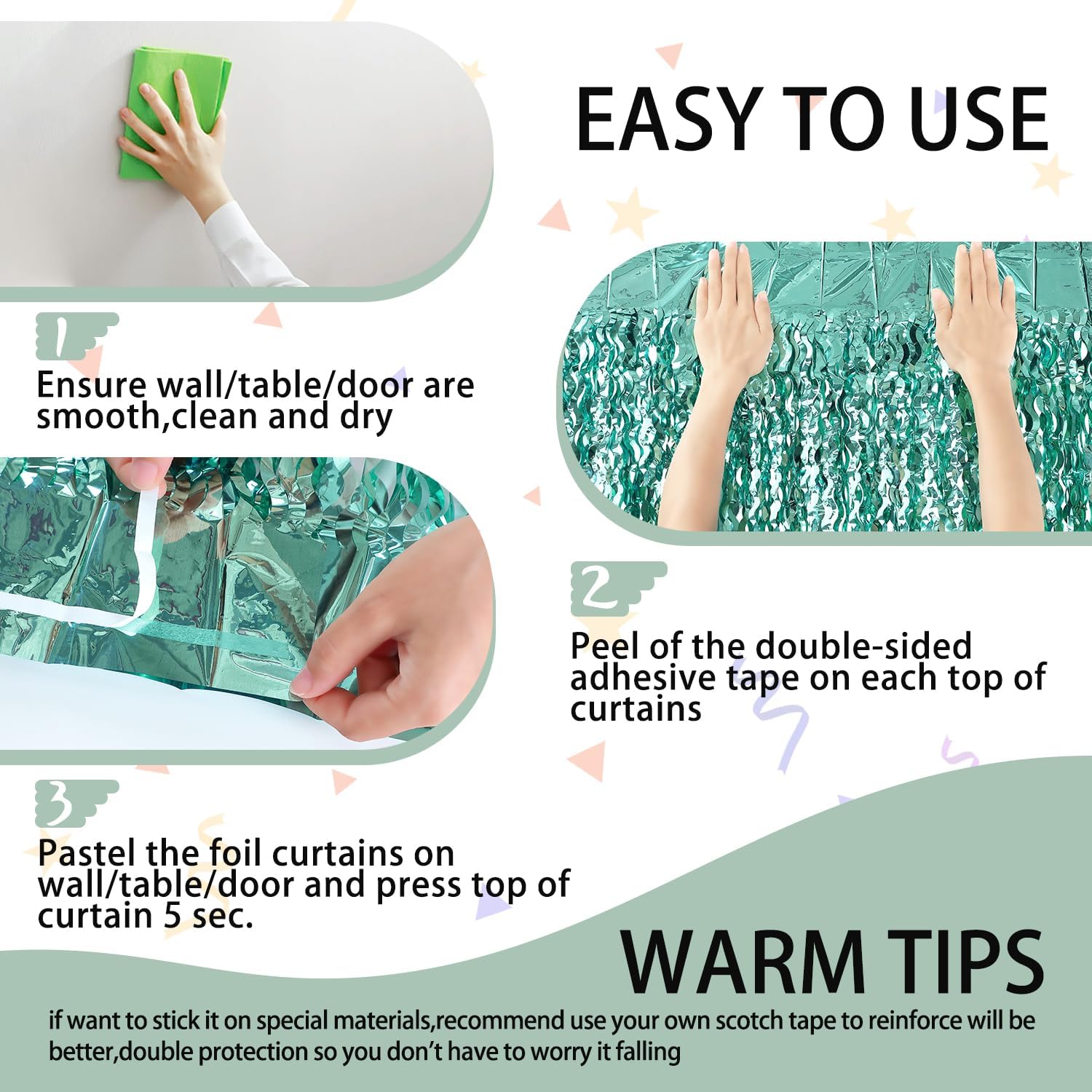 • Easy to Assemble: The back of the teal blue tinsel backdrop has double-sided tape, which can be stuck very firmly to any place you want such as walls, tables, door frames. You can use scissors to cut the length you want, and you can use two or more pieces of the curtain to splice and overlap to achieve unexpected effects!