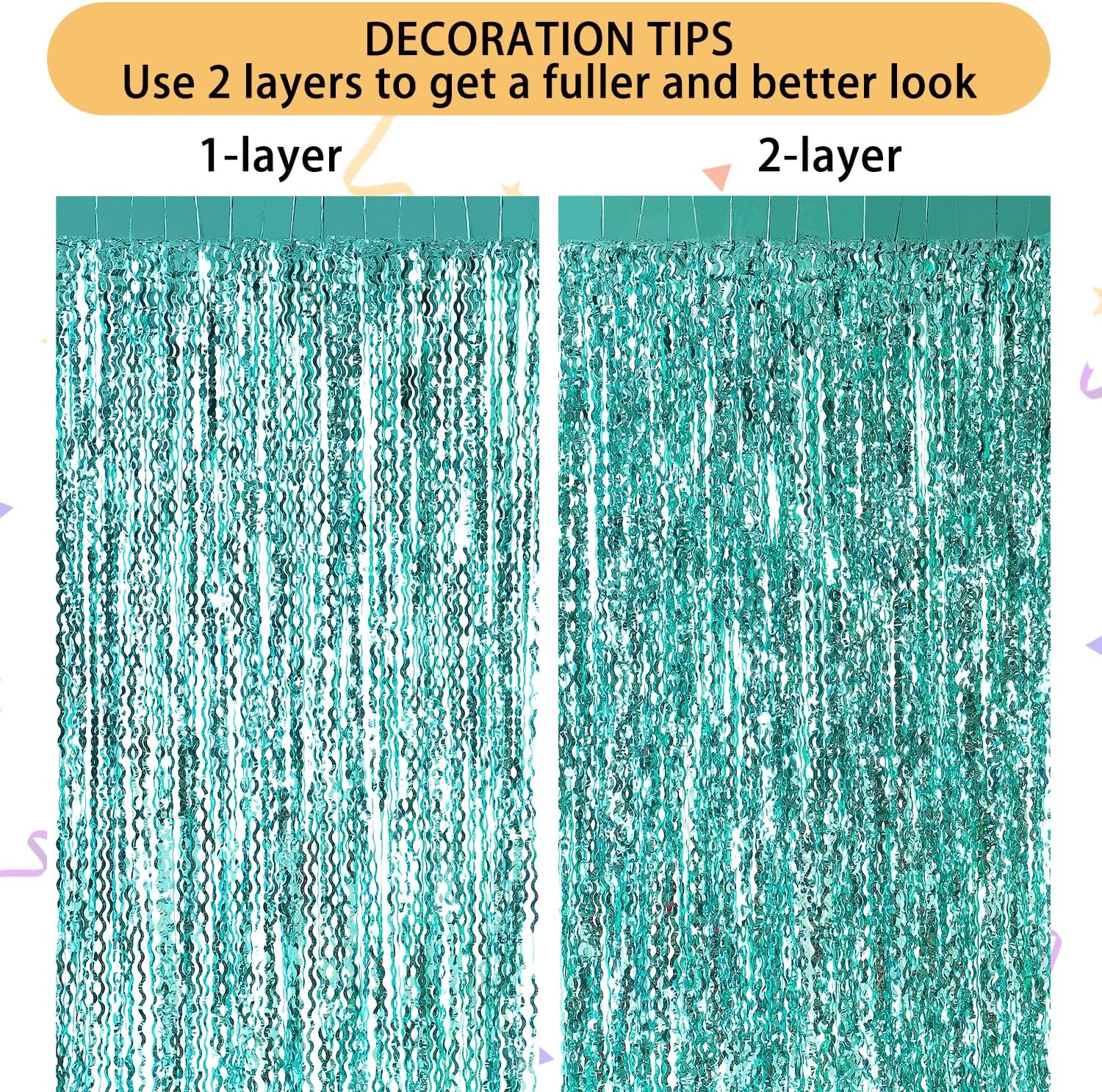 • Package Included: 3 packs teal fringe backdrop, the size of 3.3*6.6ft,It's long enough to fit any occasion,Please do not stick the foil curtain on uneven or stained walls to prevent it from falling off!!!