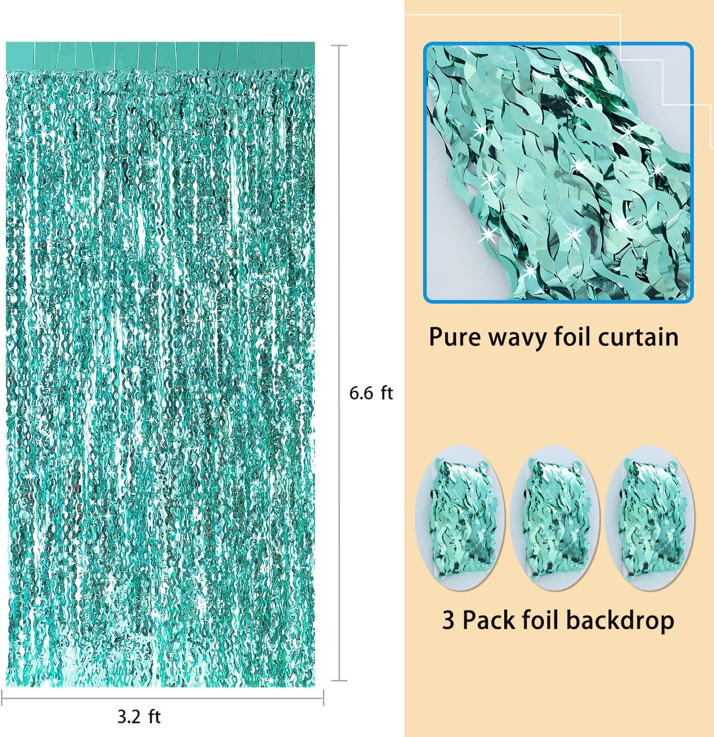 3 Pack Teal Aqua Blue Wave Foil Curtains - 3.3 ft x 6.6 ft Tinsel Metallic Streamers for Photo Booth Birthday Wedding Girl Princess Bachelorette Euphoria Theme Party Decorations