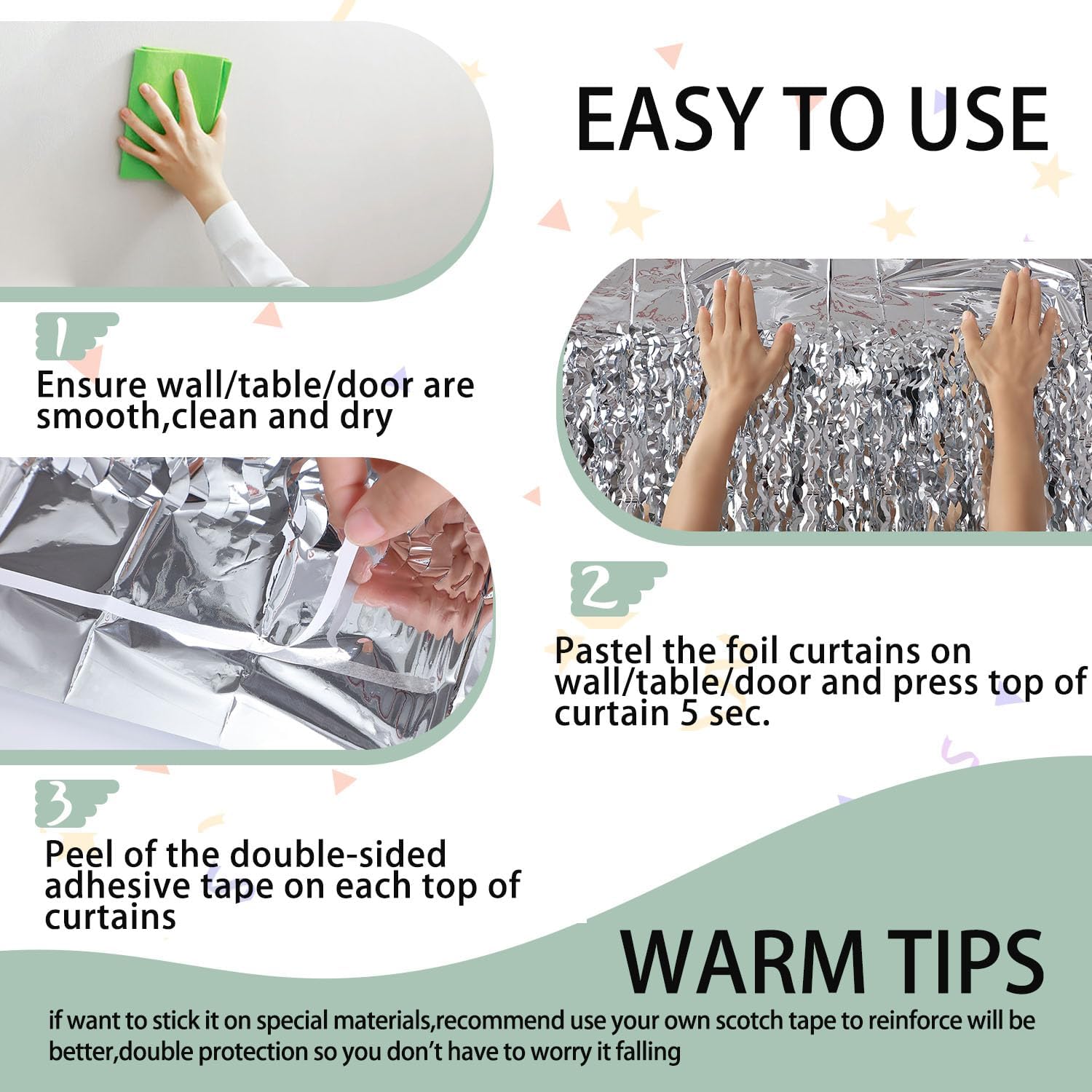 • Easy to Assemble: The back of the silver tinsel backdrop has double-sided tape, which can be stuck very firmly to any place you want such as walls, tables, door frames. You can use scissors to cut the length you want, and you can use two or more pieces of the curtain to splice and overlap to achieve unexpected effects!