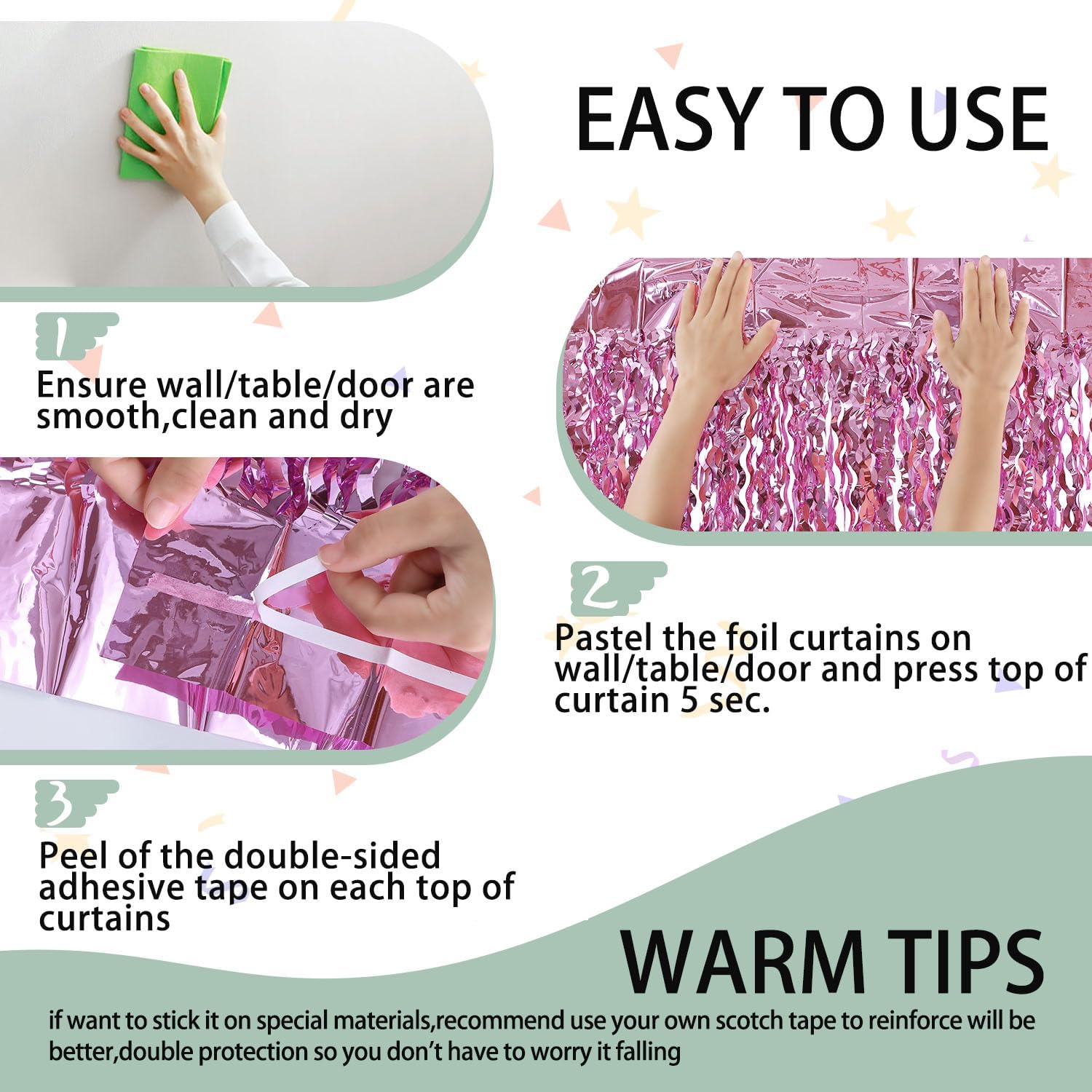 • Package Included: 3 packs pink tinsel foil fringe curtain, the size of 3.3*6.6ft,It's long enough to fit any occasion,Please do not stick the foil curtain on uneven or stained walls to prevent it from falling off!!!