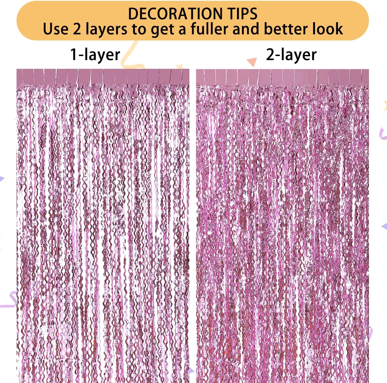 Pink Foil Fringe Curtain - Wavy Fringe Backdrop 3.3 x 6.6 Feet, Pack of 3 | Pink Streamers Party Decorations Birthday Decorations Valentine's Day Decoration Party Supplies