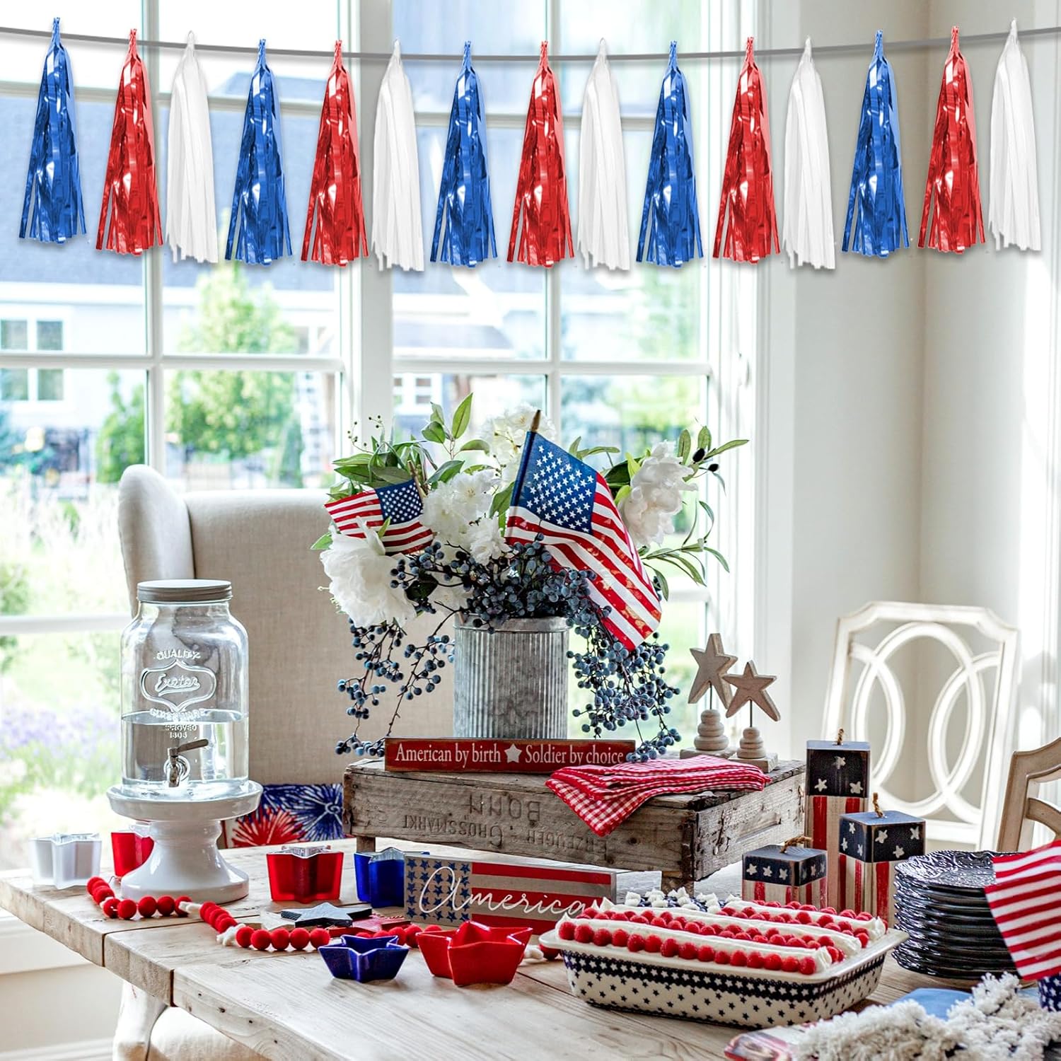 • 【Perfect Party Decoration】The Red Bule White tinsel garlands are designed in a metallic Fringe, bright, and beautiful, at the same time, they shine in the sun, and these gorgeous tassel garlands create a wonderful backdrop or centerpiece for your party space. and bring you, your family, and your friend's good Visual effects. your party many emotional and touching moments where a lot of pictures will be taken and everybody will have a wonderful time together.