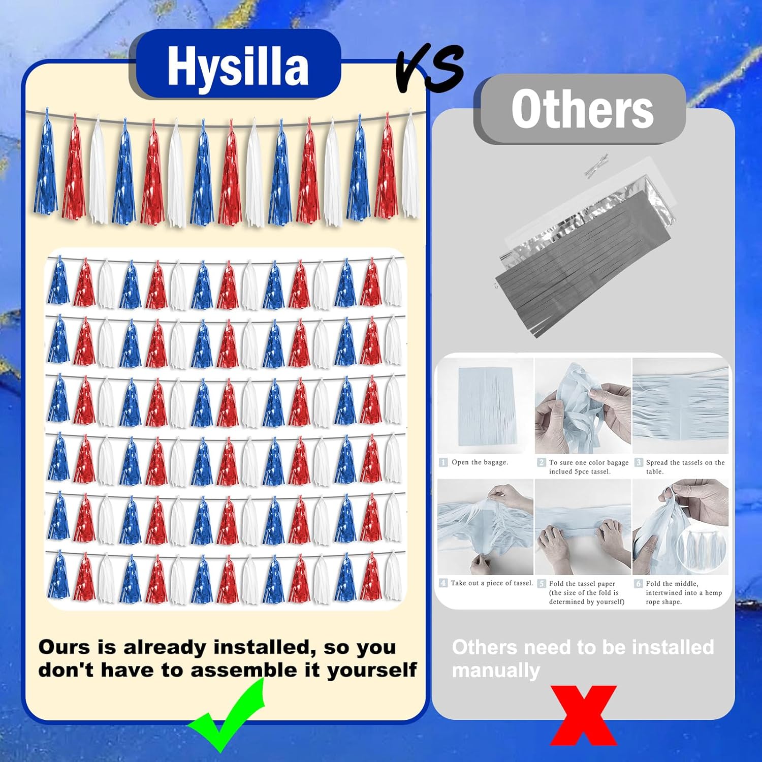 • 【Red Bule White Party Supplies Set】: The total length of the Red Bule White birthday tassels banner is 59 feet, divided into 6 strips, each 9.8 feet long. Each banner contains 15 tassels, and each tassel measures 14 inches, for birthday decorations many occasions, and so on