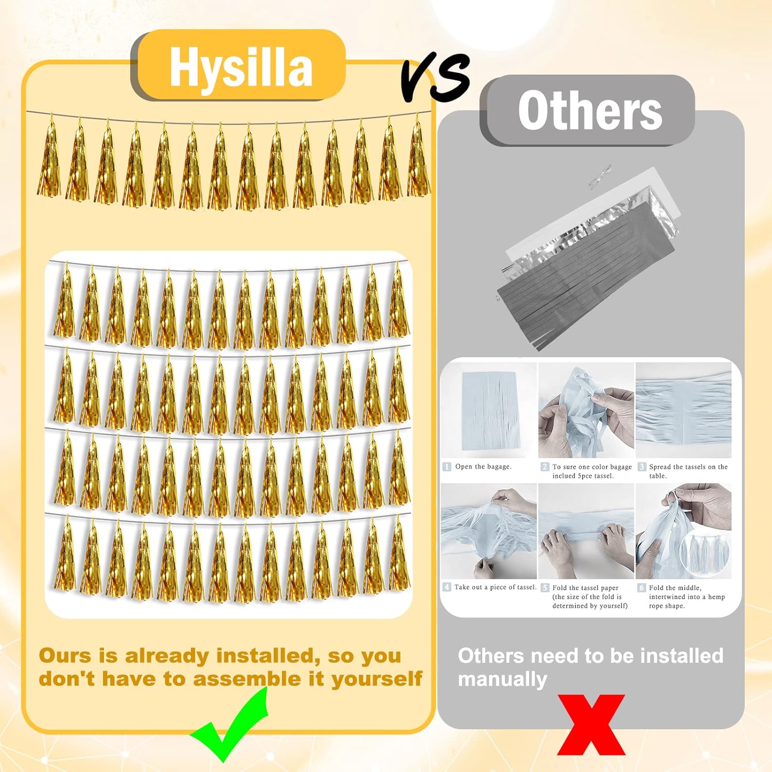 • 【Gold Party Supplies Set】: The total length of the gold birthday tassels banner is 26.2 feet, divided into 4 strips, each 6.5 feet long. Each banner contains 15 tassels, and each tassel measures 14 inches, for birthday decorations many occasions, and so on