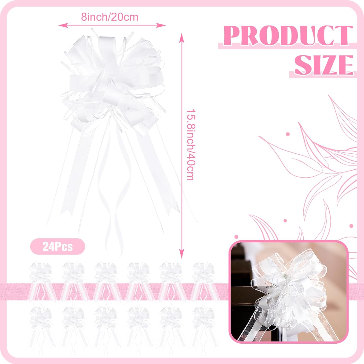• Suitable Size for Variety: you will get 24 white bows; Our white pull bows have a flexible size that fits various applications; Before pulling, these bows measure up to about 2.6 inches wide and 74.8 inches long; After pulling, they transform into a pretty flower measuring around 8 x 15.8 inches, making them adorable