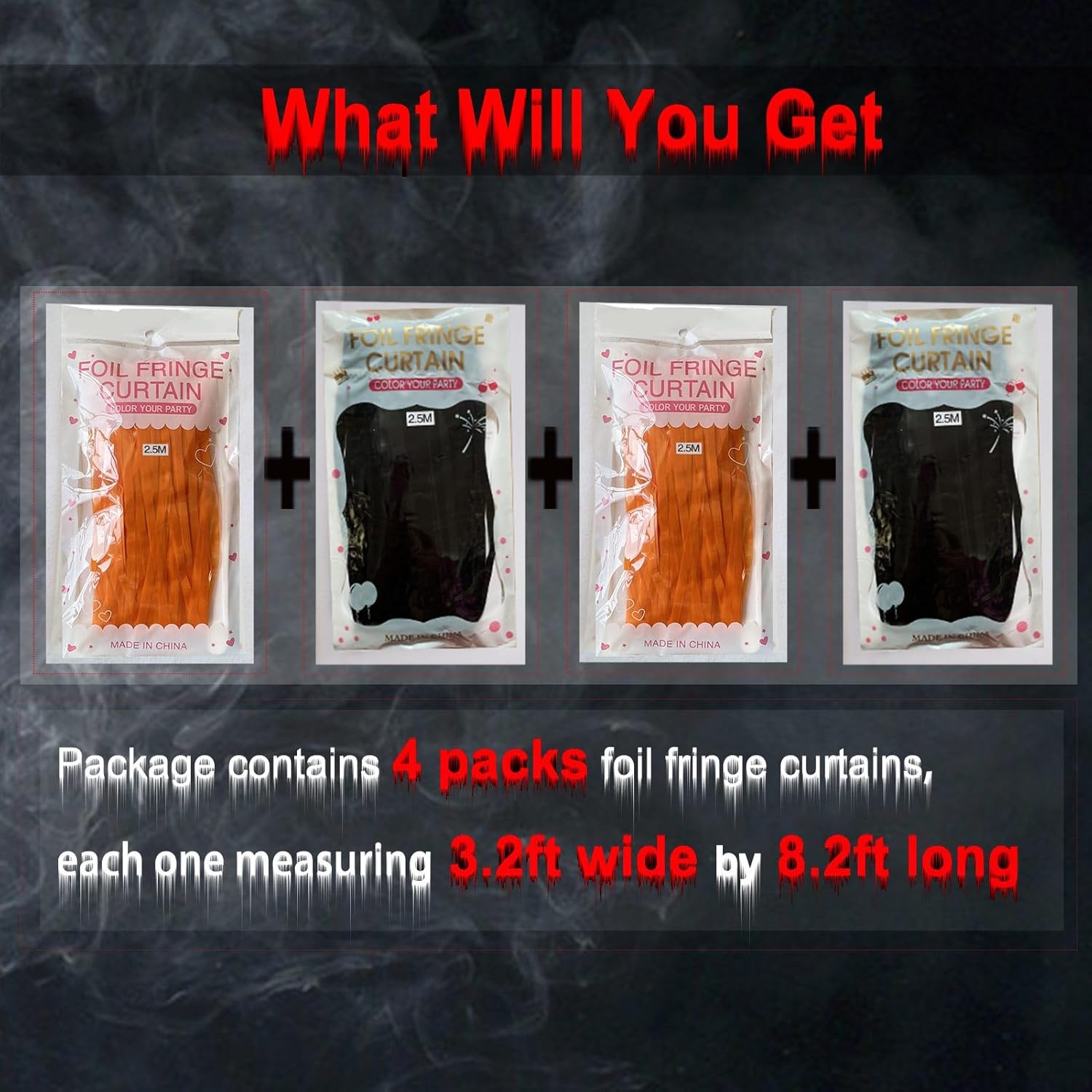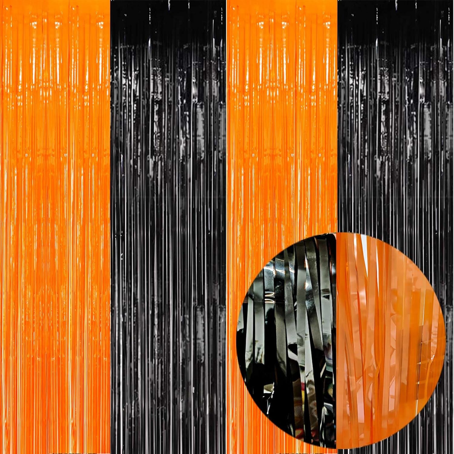 • ORANGE BLACK METALLIC TINSEL FOIL FRINGE CURTAINS: The package includes 4packs foil fringe backdrop curtains(2pack orange +2pack black), each metallic tinsel curtain is 3.2ft(wide)×8.2ft(drop), wonderful accessories for decorating doorway, window and walls. This stunning foil fringe curtain has a metallic finish that will add a touch of glamour to your party.