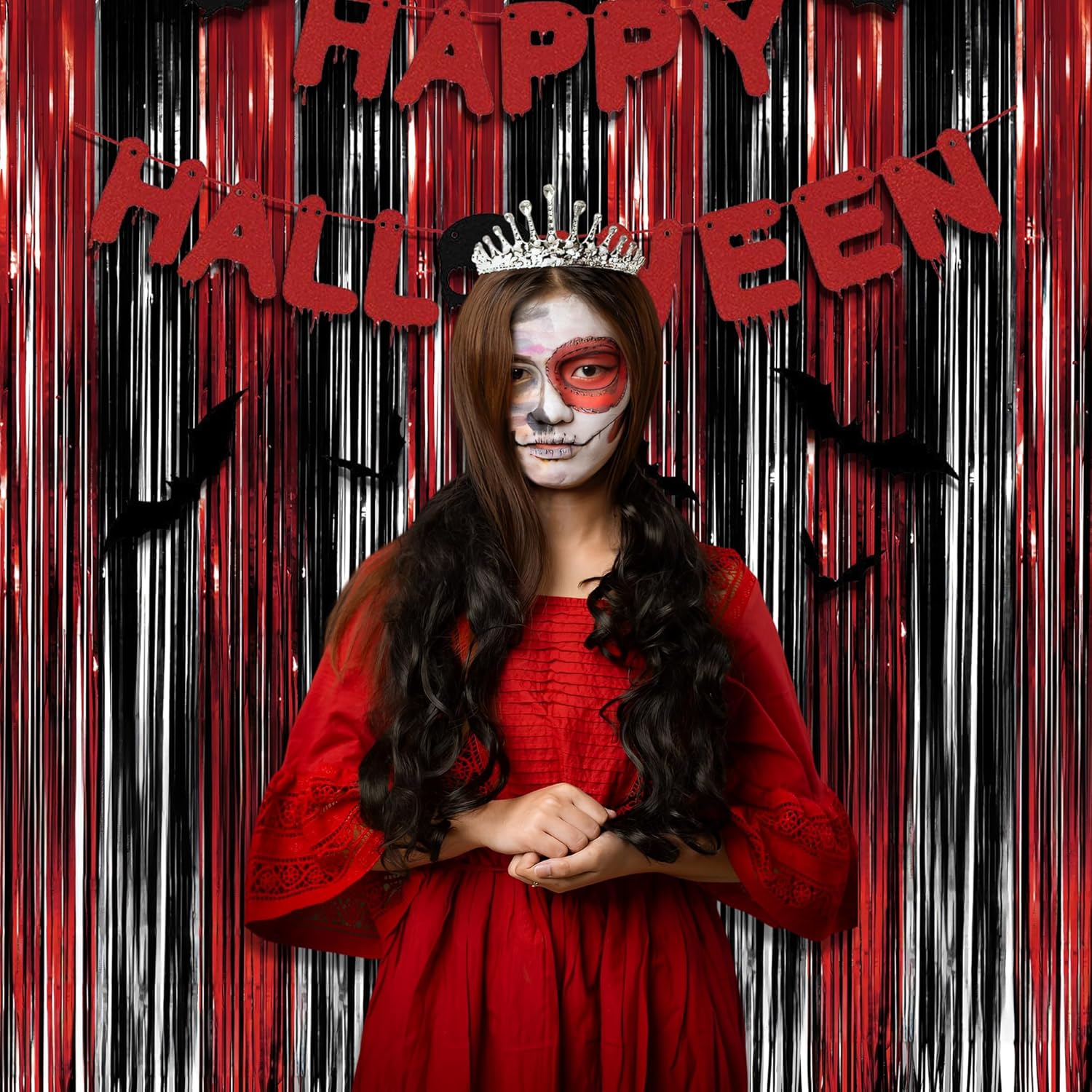 Black Red Party Streamers Backdrop - GREATRIL Foil Fringe Tinsel for Stranger/Friday Party/Halloween Party Decorations - 3.2ft X 8.2ft - 2 Packs