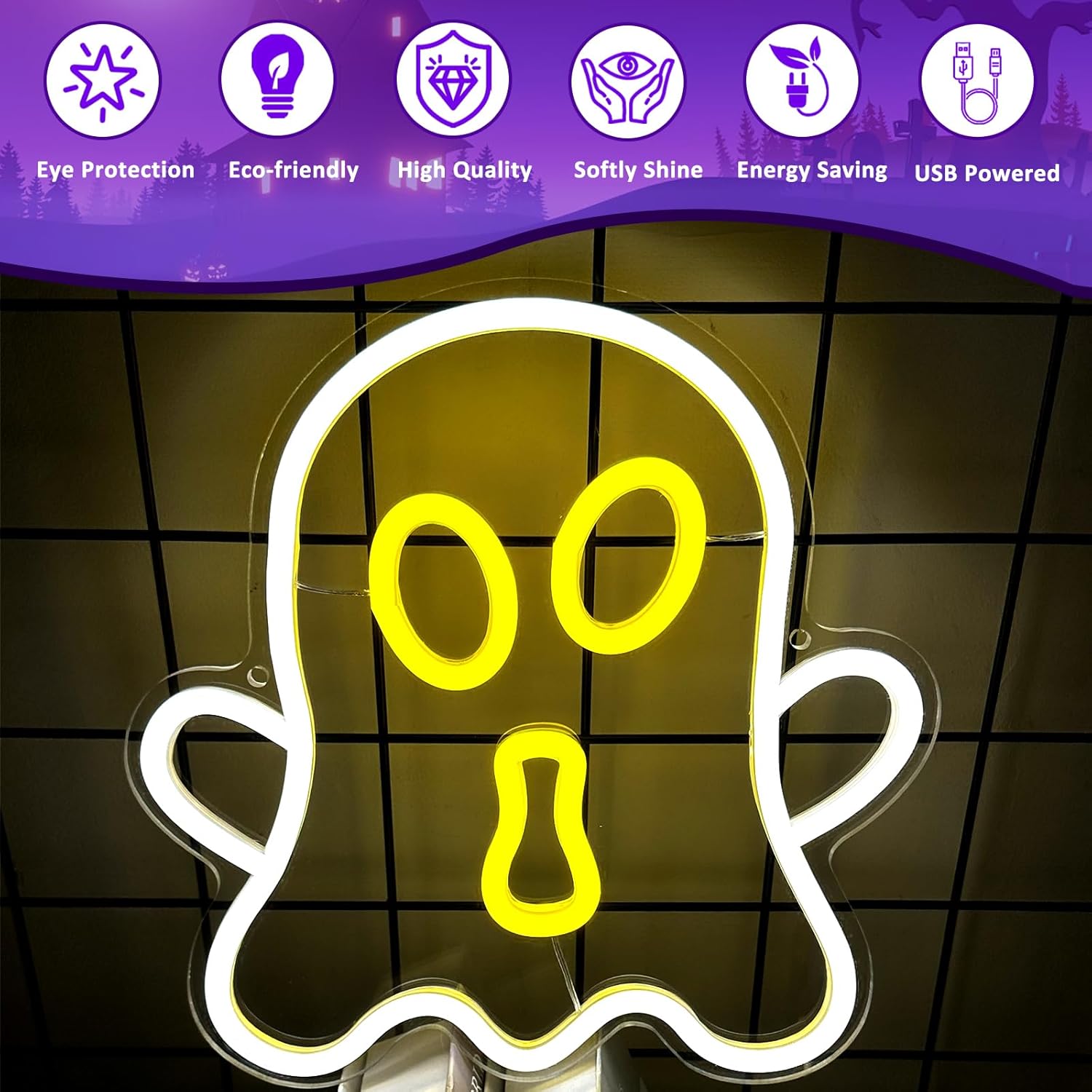 • USB POWERED: The Halloween Ghost neon lights are powered by USB, portable and convenient. It can be connected to a power bank, laptop, computer, etc., and it can be continuously lit anywhere.