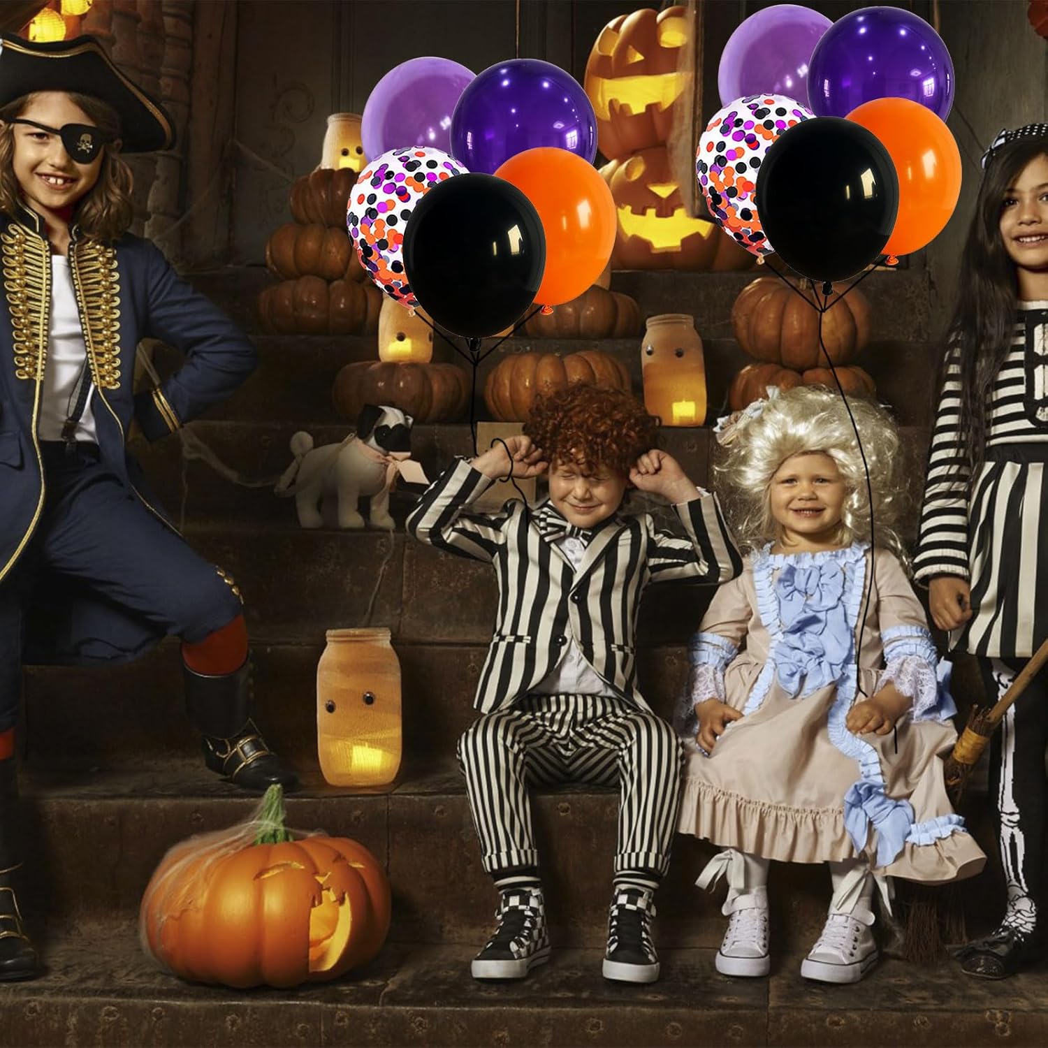 • 💀 Multiple Applications - Whether you're hosting a Halloween costume party, Halloween party decorations, Halloween birthday party supplies, trick or treat party supplies, spooky ghost theme parties, and haunted house decorations, or simply want to add a touch of Halloween spirit to your home, this black purple orange balloons set is a versatile choice. Hang it on walls, across doorways, or as a stunning table centerpiece.