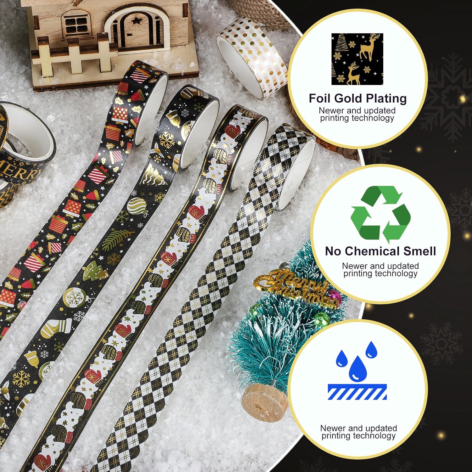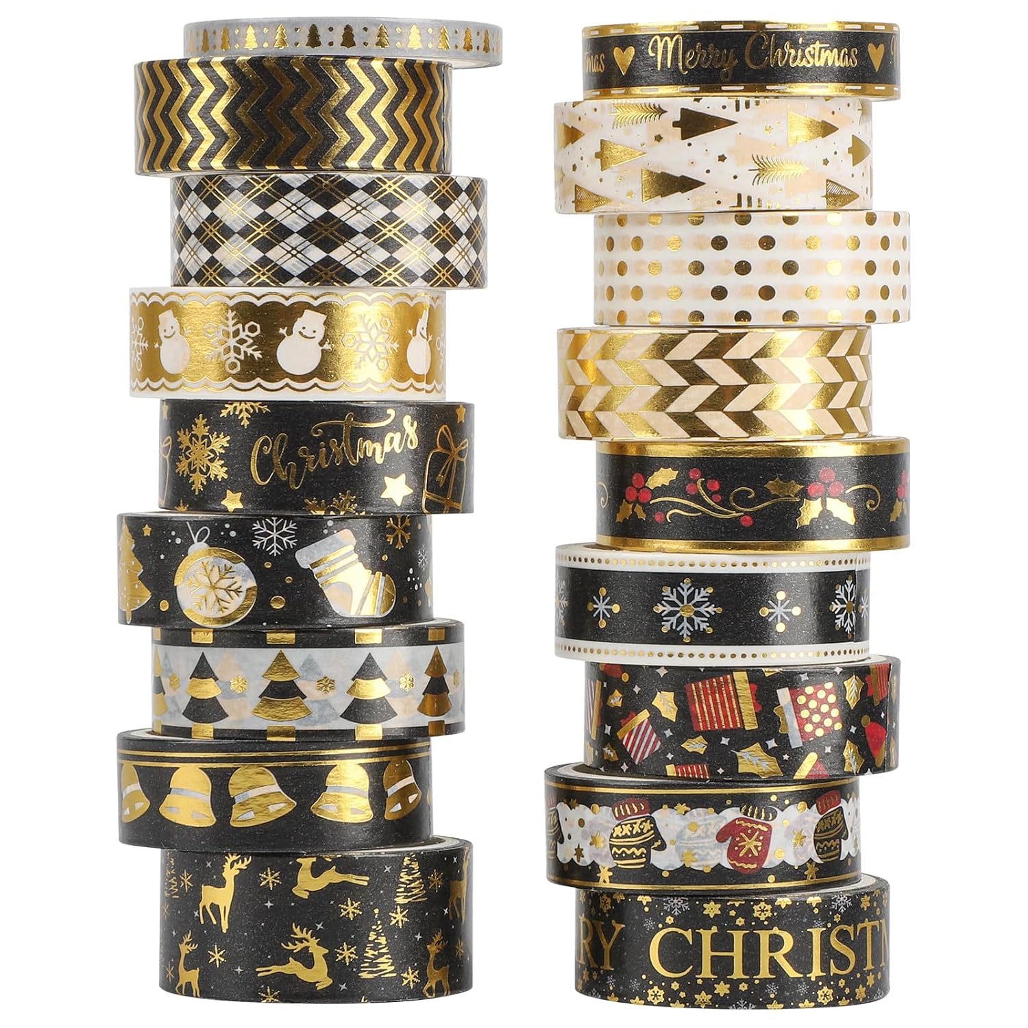 18 Rolls Christmas Washi Tape Holiday Masking Tape Black Christmas Wrapping Tape Glod Silver Foil Decorative Tape for Christmas Scrapbook Journal DIY Craft Gift Wrapping(Xmas Black