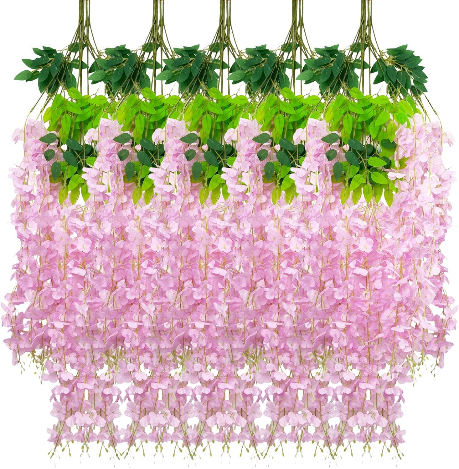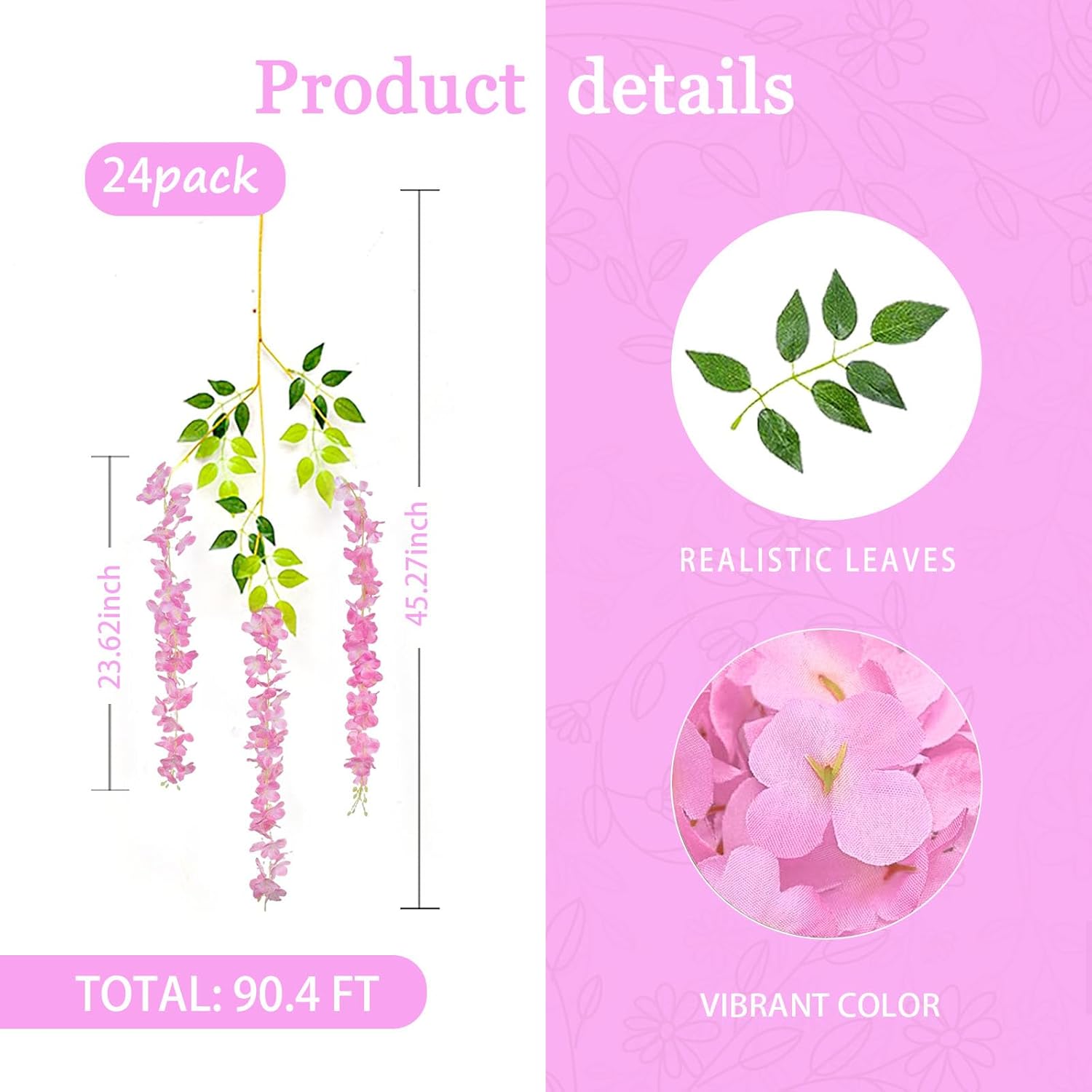 • 【Package Included】24 pieces of silk pink wisteria hanging flowers, each length 45.27 inches. Every artificial wisteria garland has 3 branches and 6 leaves, the wisteria flower petal length is 23.62 inches. (Note: There may be some color differences in different lights)