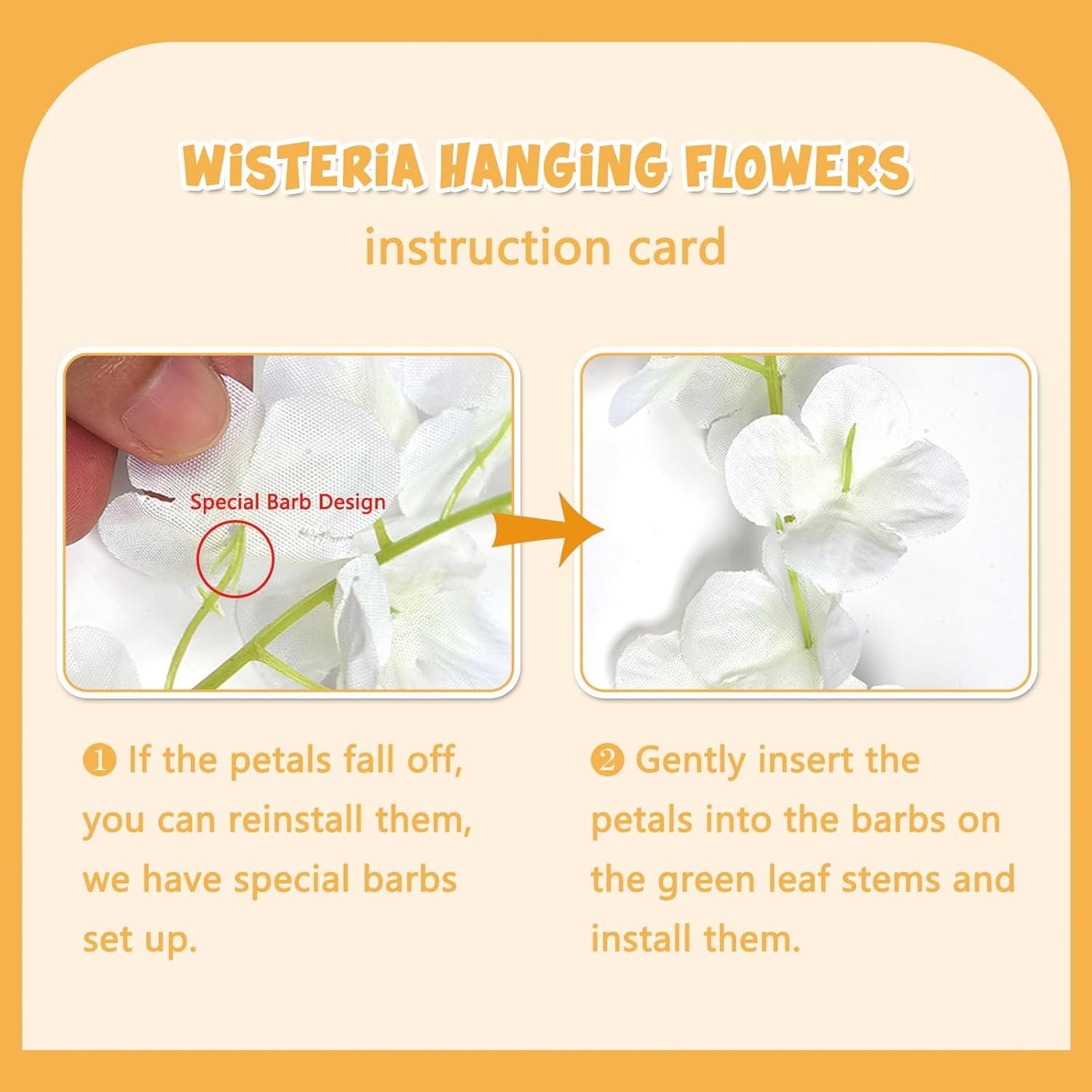 • 【Suitable for A Variety of Scenes】Orange Wisteria Garland flowers have a purely natural pattern design, realistic and natural, suitable for decorating living rooms, bedrooms, study rooms, and windowsill places, so that your living space into the natural atmosphere, become more comfortable. At the same time, they are also suitable for decorating dinner parties, birthday parties, weddings, and other places, to create a warm atmosphere, so that your guests leave a good and unforgettable memory.