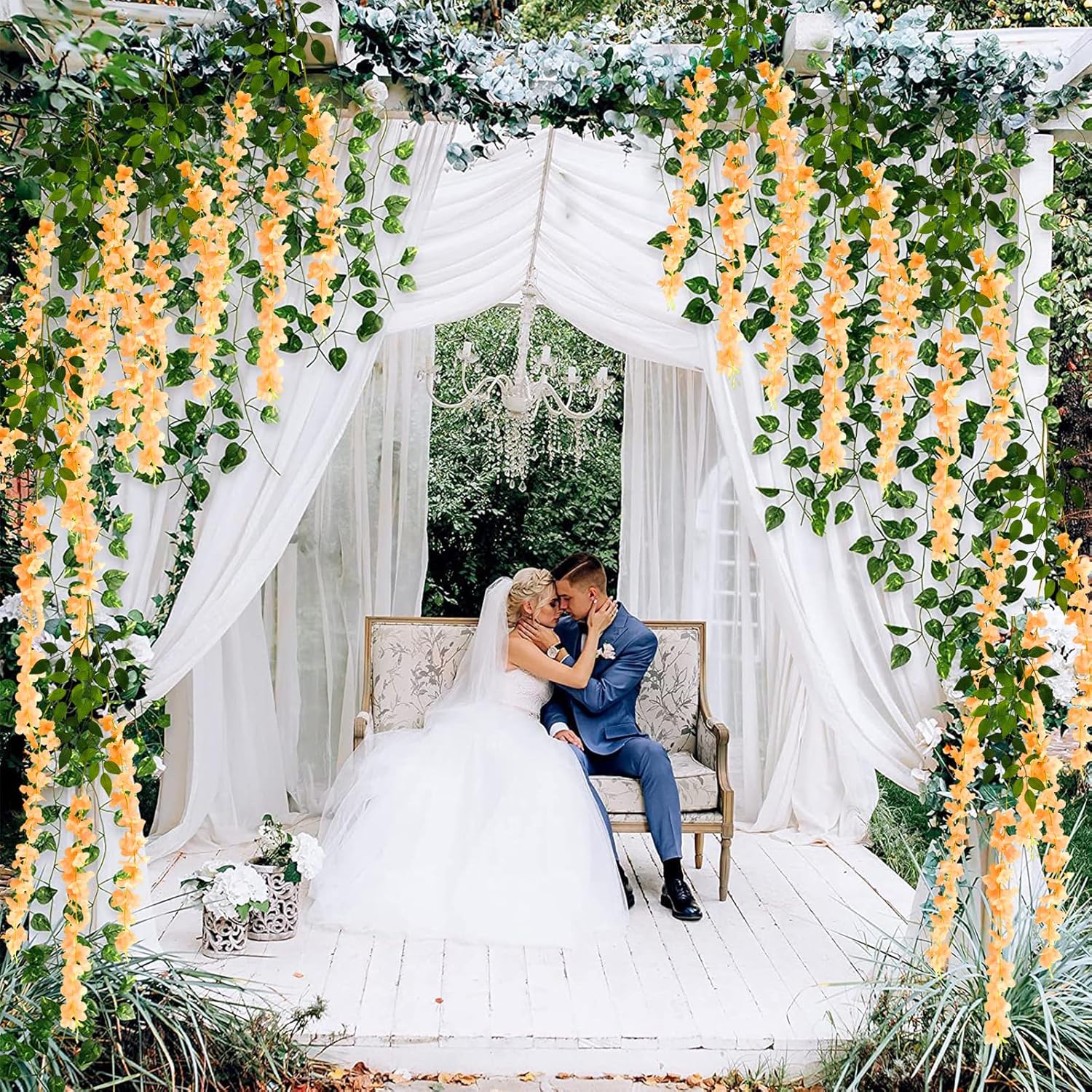 • 【Package Included】24 pieces of silk orange wisteria hanging flowers, each length 45.27 inches. Every artificial wisteria garland has 3 branches and 6 leaves, the wisteria flower petal length is 23.62 inches. (Note: There may be some color differences in different lights)