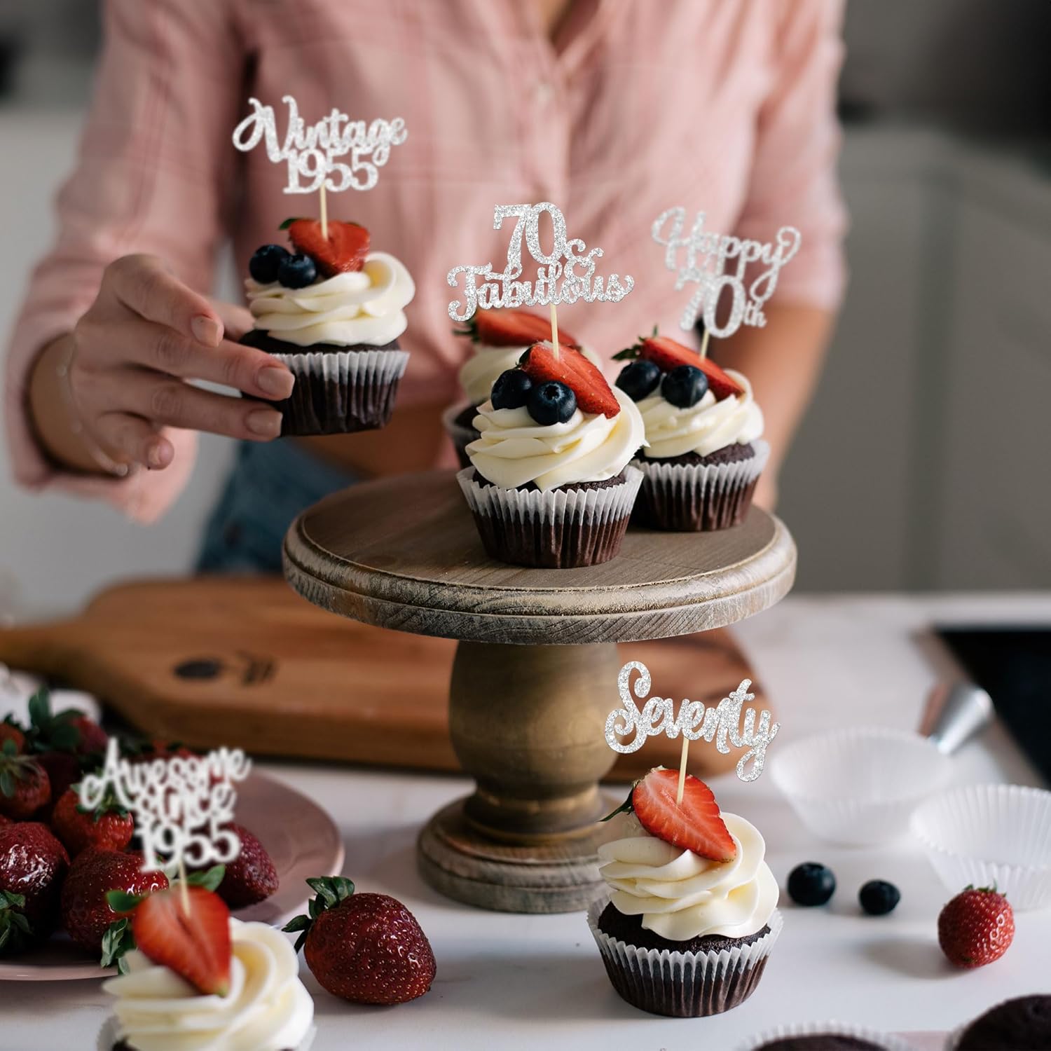 30Pcs Happy 70th Birthday Cupcake Toppers Glitter Seventy Vintage 1955 Cupcake Picks Cheers to 70 Fabulous Cake Decorations for 70th Birthday Wedding Anniversary Party Supplies Silver