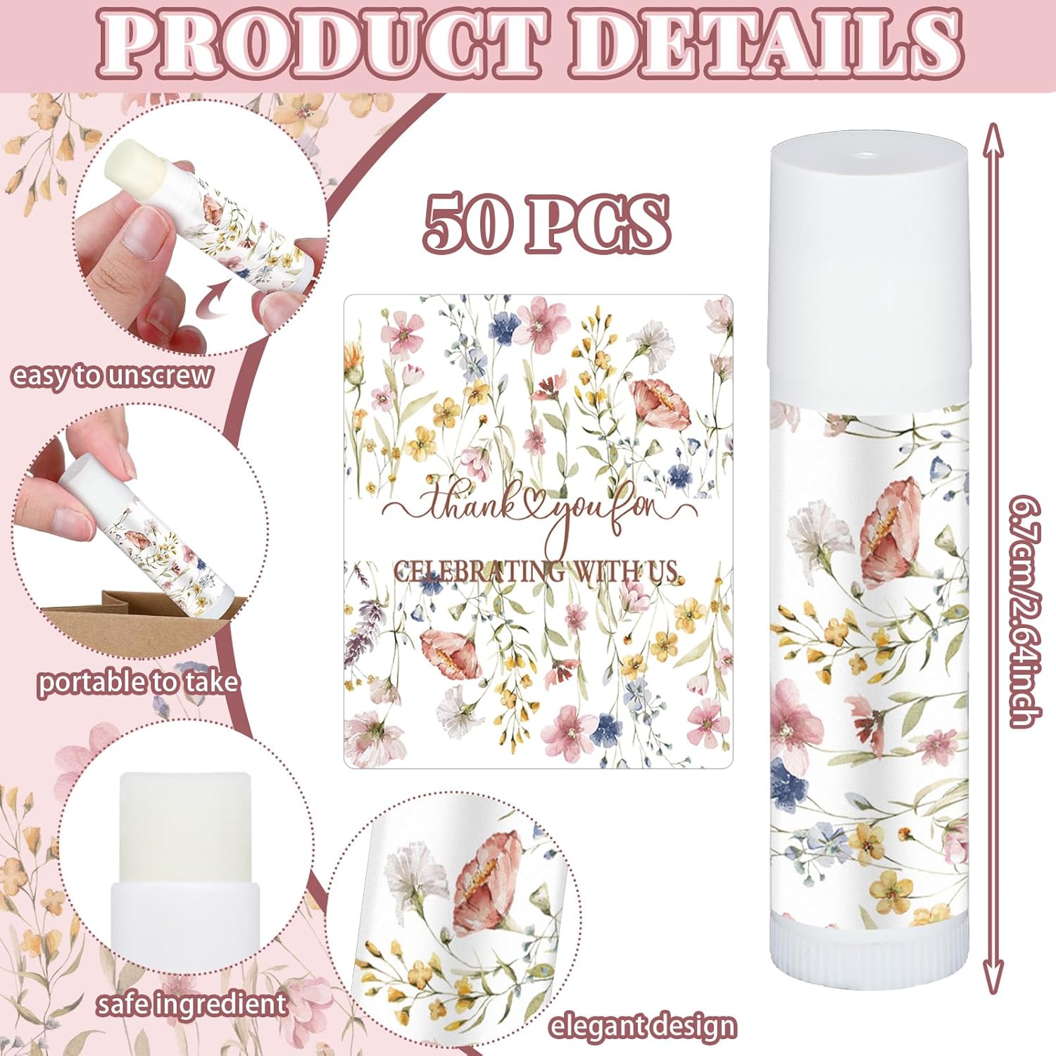 • Lip Balm Favors: you will get 50 pieces of wedding lip balms printed beautiful floral and thankful phrases, cute small wedding souvenirs which smell good and guests will enjoy them