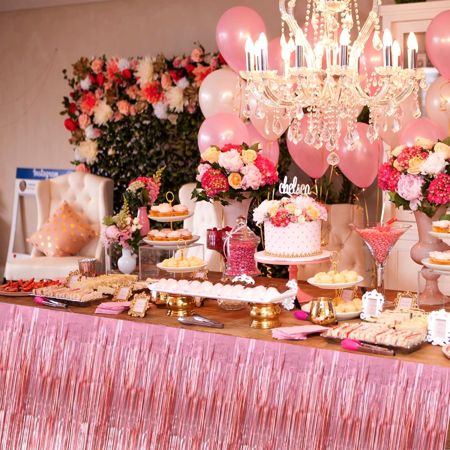 4 Pack 29x108 Inch Metallic Foil Fringe Tinsel Table Skirts for Rectangle Tables Streamer Backdrop for Wedding, Birthday, Parade Floats, Christmas, Halloween Party Decoration(New Rose Gold)