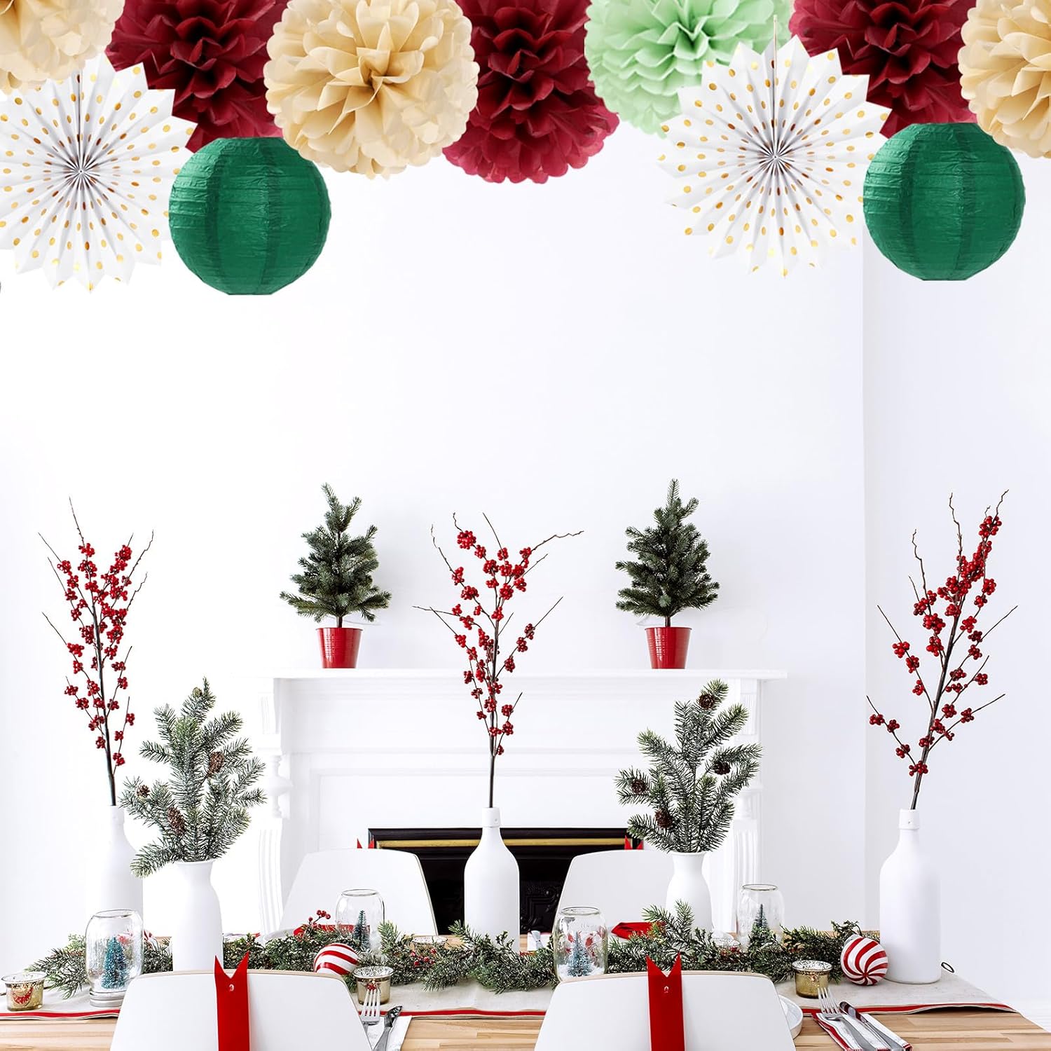 • [Package Includes] Sage olive green burgundy champagne boho party decorations kit contains: 1 x triangle bunting, 4 x paper fans, 9 x tissue pom poms, 2 x honeycomb balls, 4 x paper lanterns, a total of 20 pieces of various sizes of decorations. Better embellish your party.