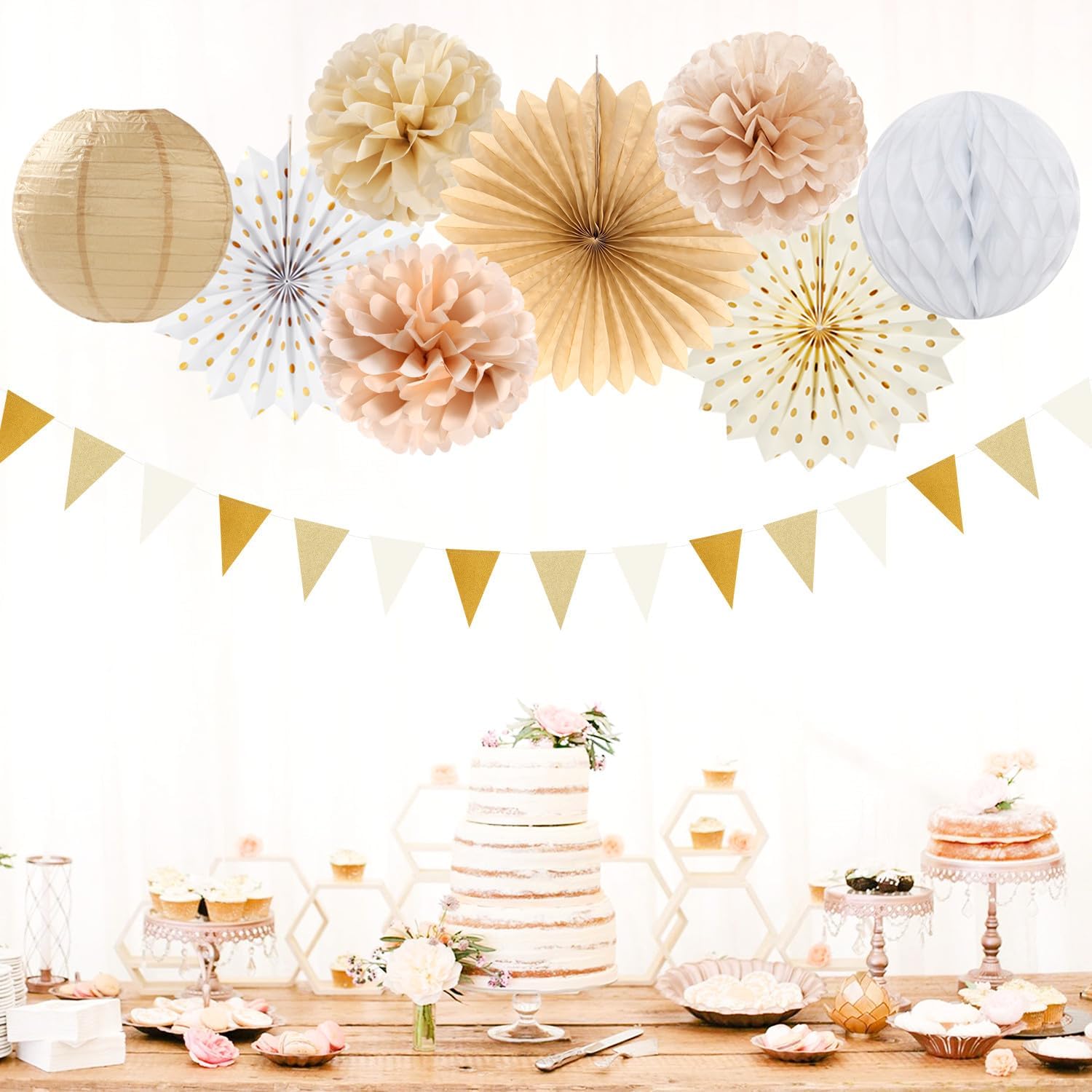 Beige-Champagne Gold White-Peach Boho Party-Decorations - 20pcs Neutral Baby Shower Rustic Wedding Paper Lanterns Fans,Tissue Pom Poms,Honeycomb Balls,Bunting,Birthday Bridal Decor Burgleda
