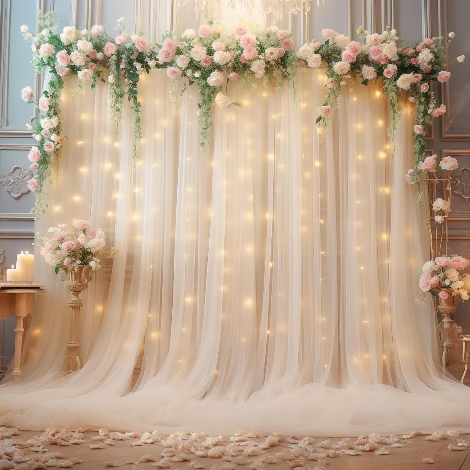 • 【Elegant Sheer Draping Fabric】Our champagne backdrop curtain are crafted from high-quality delicate soft and smooth tulle.The fabric is so dreamy. It's like a semi sheer dress that flows in the wind, so romantic. And it's also lightweight to wear, the wind was able to blow it for a dramatic effect.