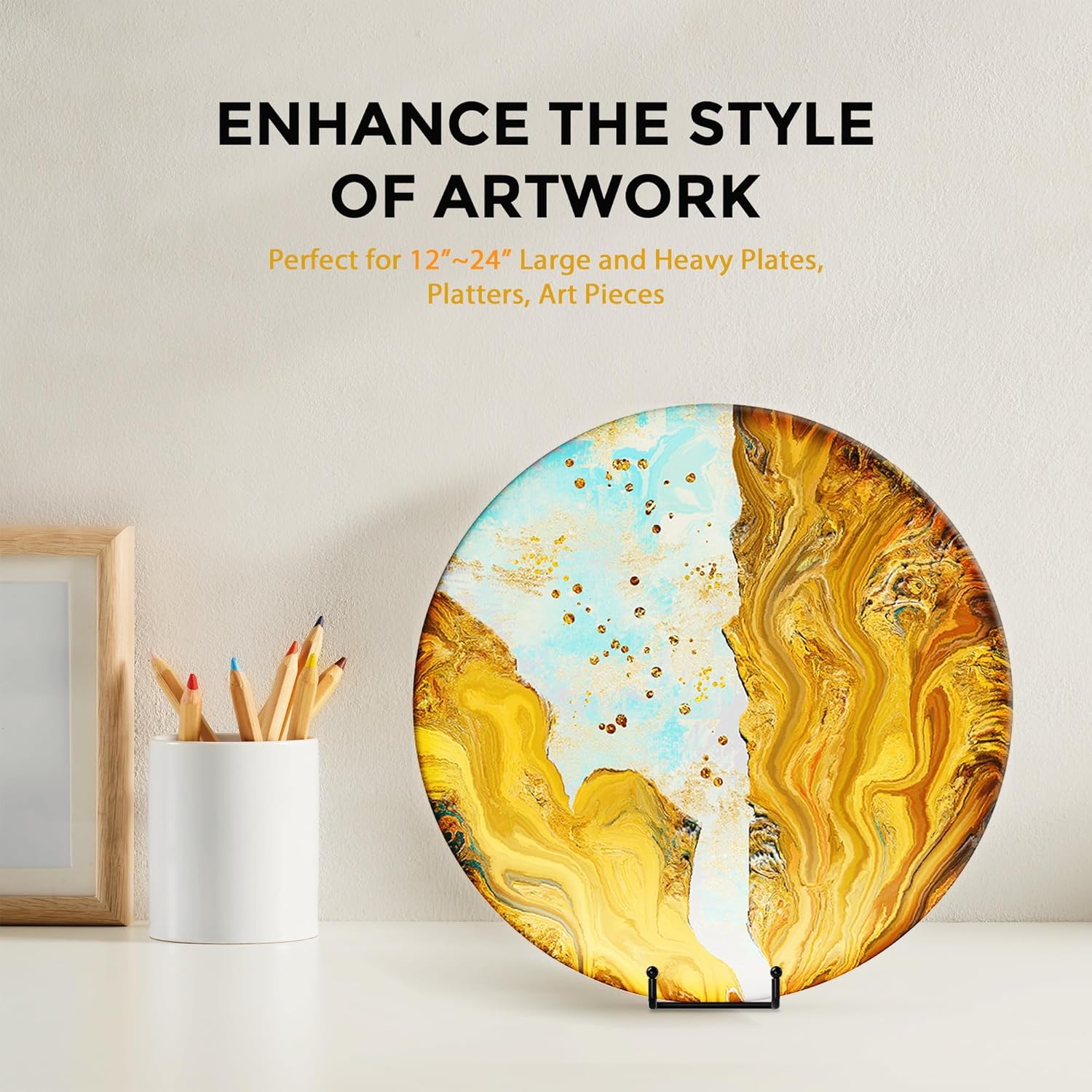 • STURDY DESIGN: - Made with wrought iron construction and a matte black powder-coated finish, this 12" plate display stands features a reliable 9.8" depth and 4" widened base design, capable of securely displaying a variety of large items such as decorative plates, platters, plaques, photo frames, trays, tiles, cutting boards, cookbook, sign, canvas art, and more.