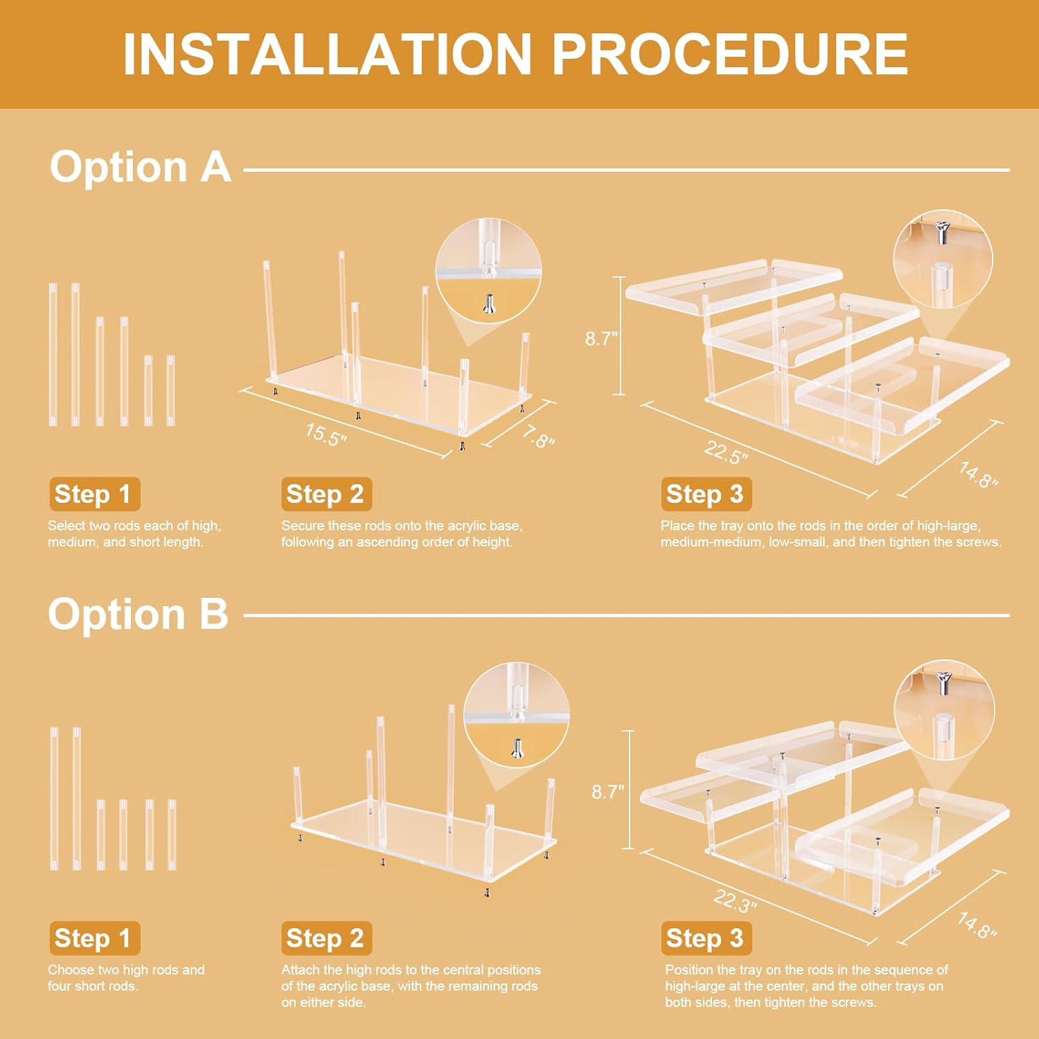 • [Effortless Installation] Our dessert stand is thoughtfully designed with an acrylic rectangular serving tray and sturdy struts. You can easily set it up within minutes by securely fastening the nuts onto the tray. The dimensions of the tiered serving tray are as follows: 14.8" x 8.3", 14.4" x 7.9", and 14" x 7.5"