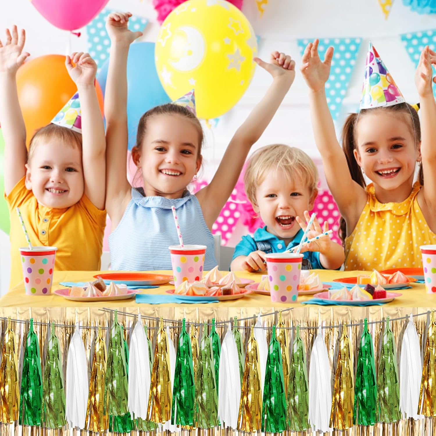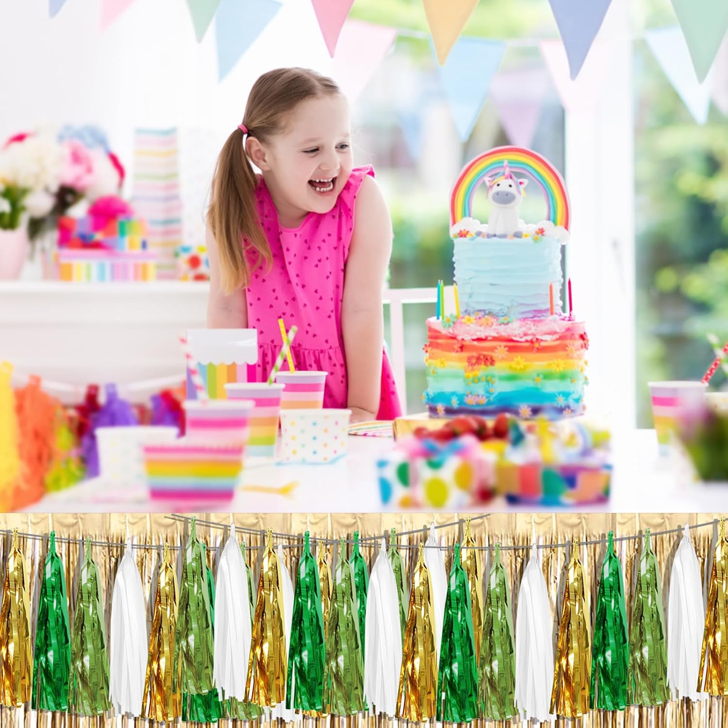 • 【Light Green White Gold Green Party Supplies Set】: The total length of the Light Green White Gold Green birthday tassels banner is 29.5 feet 45tassels, divided into 3 strips, each 9.8 feet long. Each banner contains 15 tassels, and each tassel measures 14 inches, for birthday decorations many occasions, and so on
