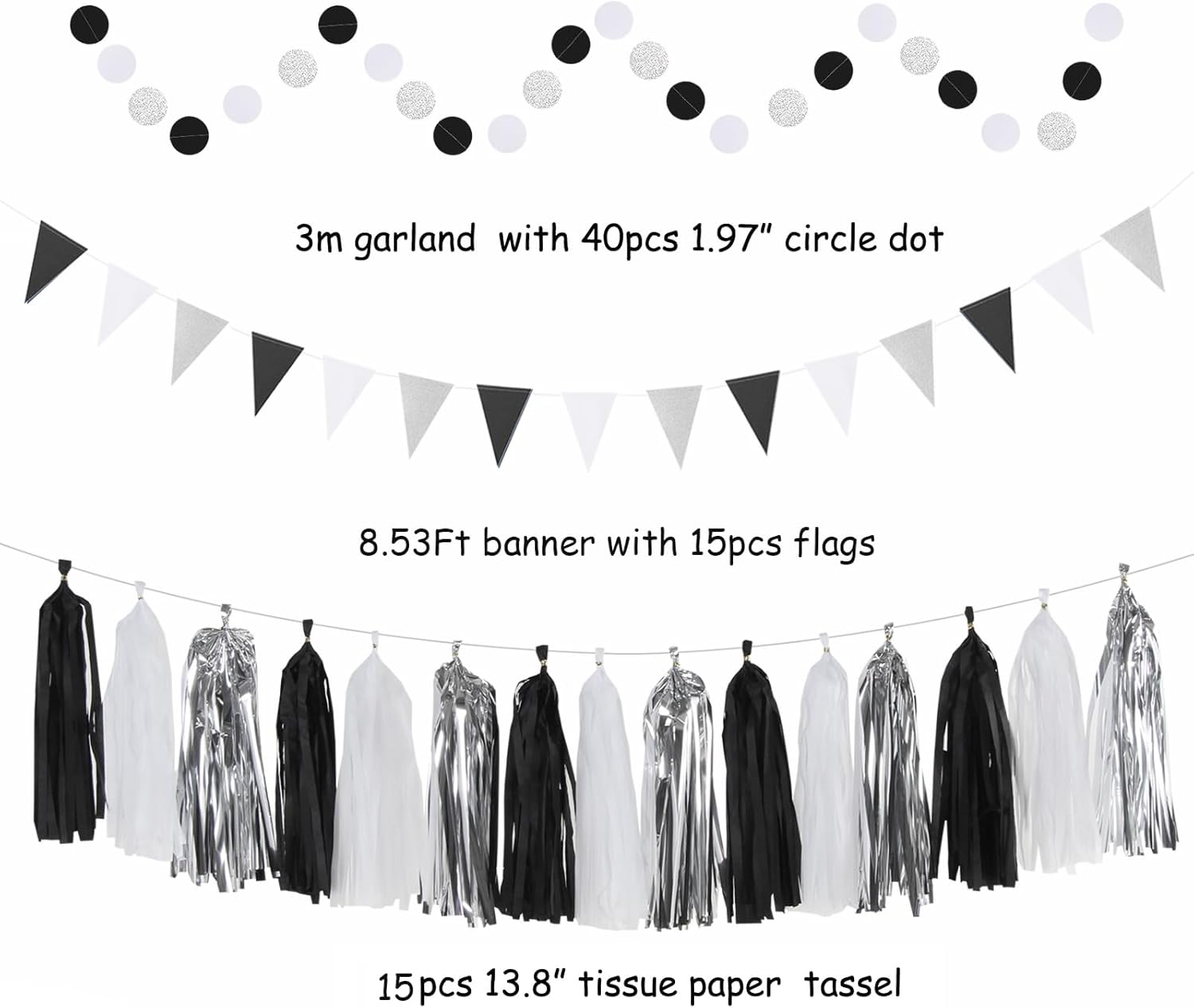 Black White-Silver Party-Decorations - 33pcs Kits Banner,Graduation Streamer Tassel Garland,Tissue Pom Poms Honeycomb,Paper Lantern Fans,Birthday Wedding Baby Bridal Shower New Years Decor Hugtmr
