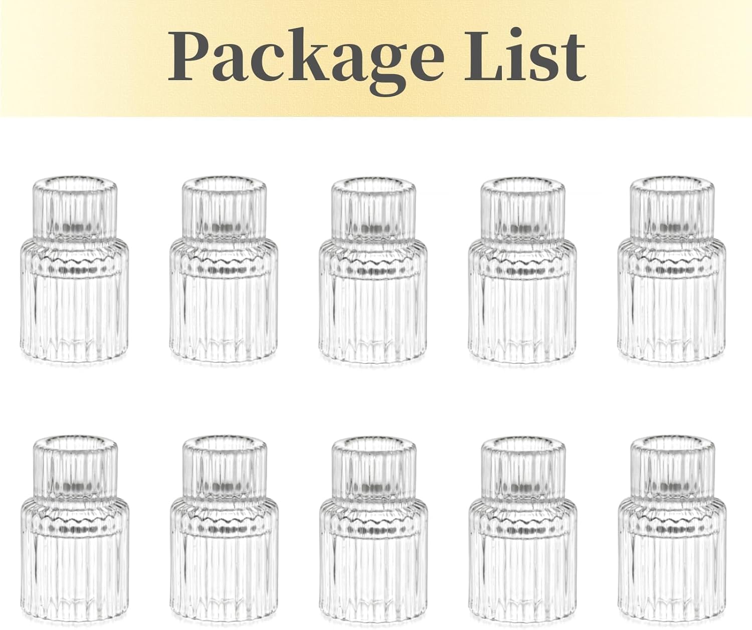• 【Multiple Occasions Use】The candlestick holders bulk comes with 10 pcs clear ribbed glass candle holder. It's suitable for holiday celebration like Valentine's day, Christmas, Thanksgiving, or special occasions like weddings, parties, engagements. Its simple & dainty design will make a great addition to any decor.