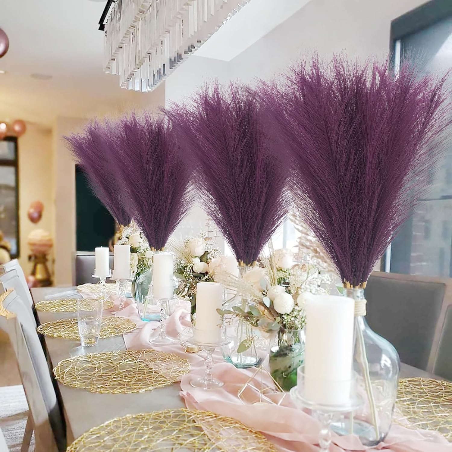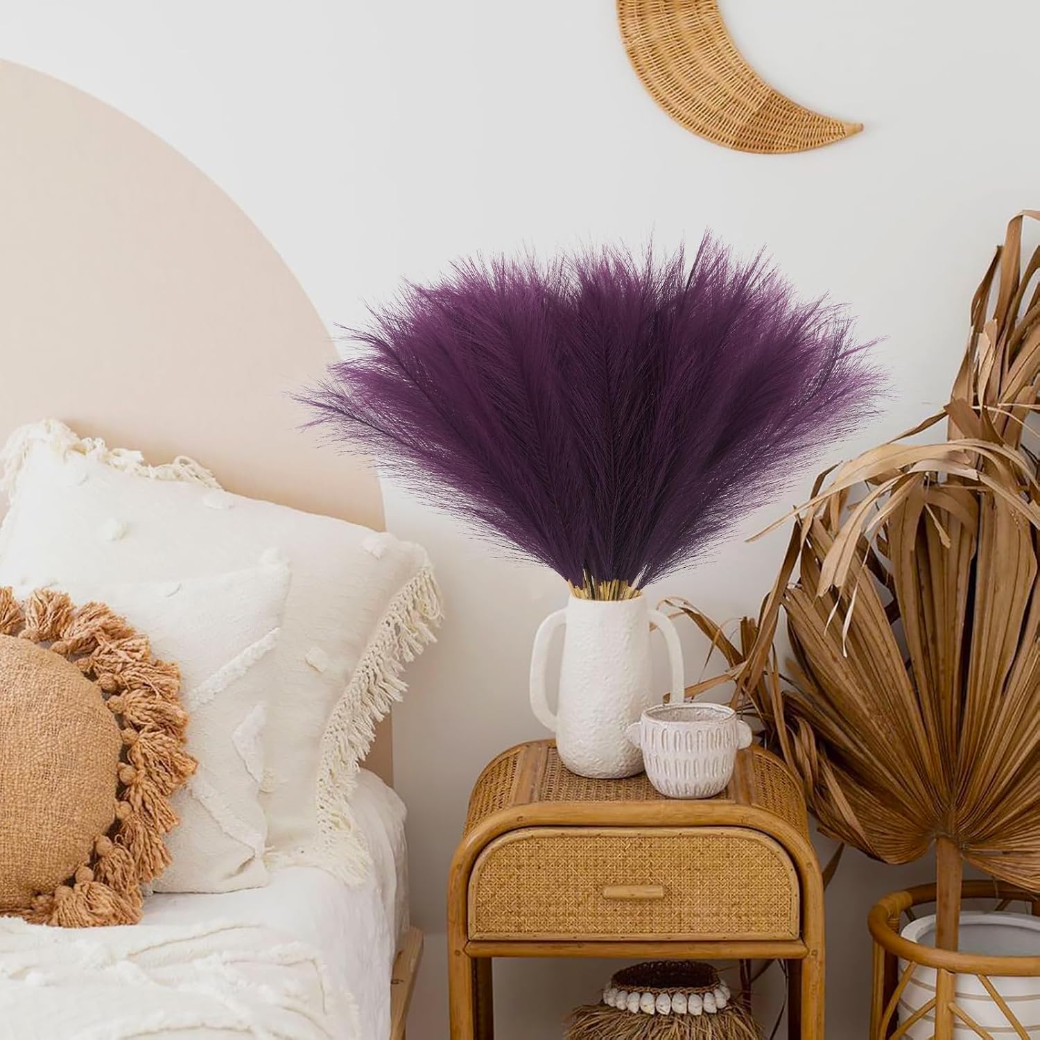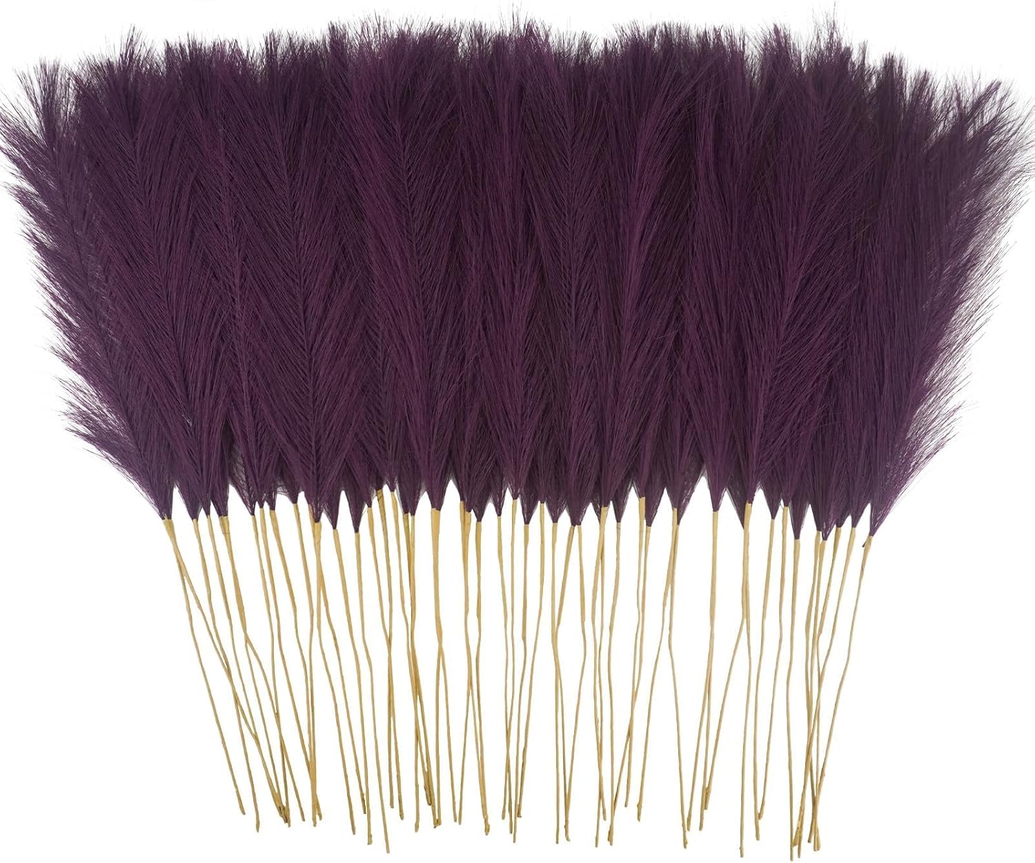 • Purple Pampas Grass Decor: You will get a pack of 50pcs artificial pampass grass, each stem 21.6”, and the heads of each stem is designed you can fluff them up for a fuller look, create a chic minimalist, or Bohemian modern display to complement your existing home arrangement
