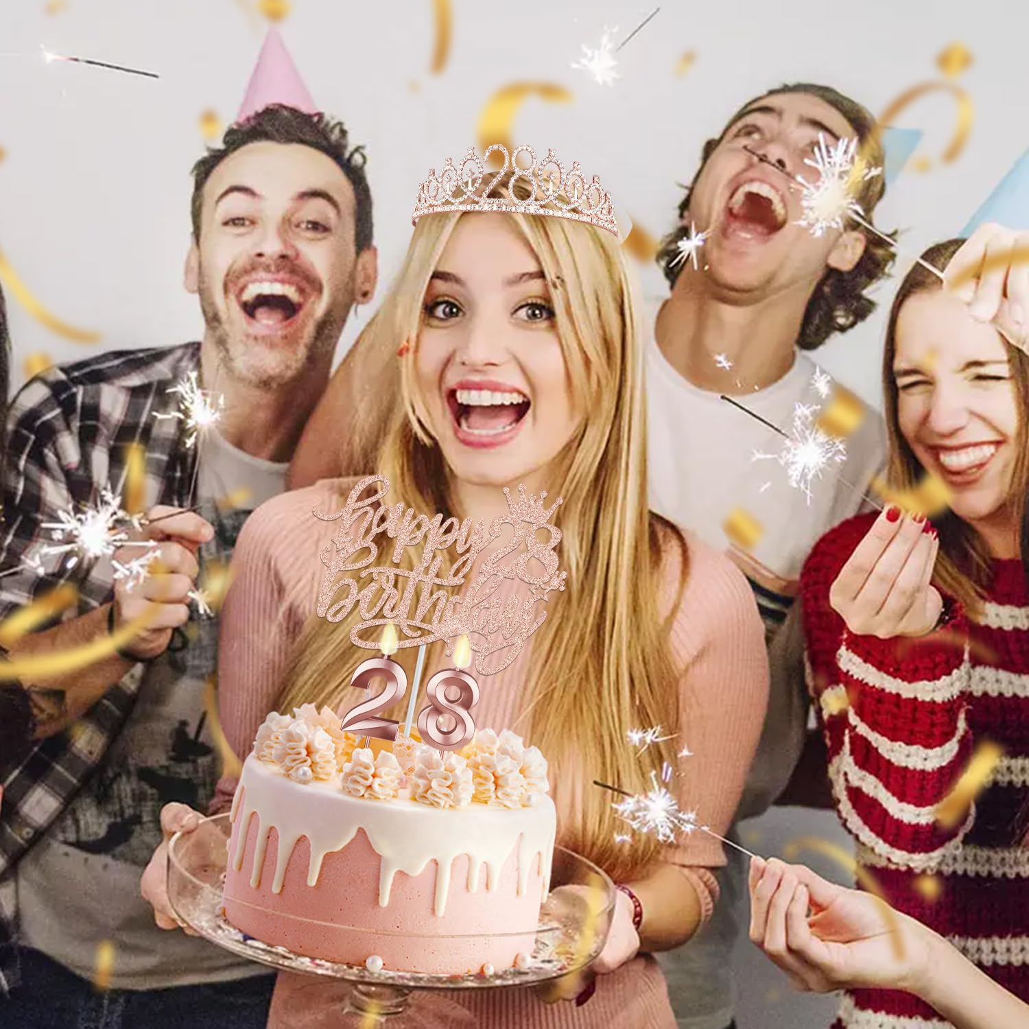 28th Birthday Decorations for Women with Birthday Sash and Tiara, Candles and Cake Topper, Gifts for 28 Year Old Woman