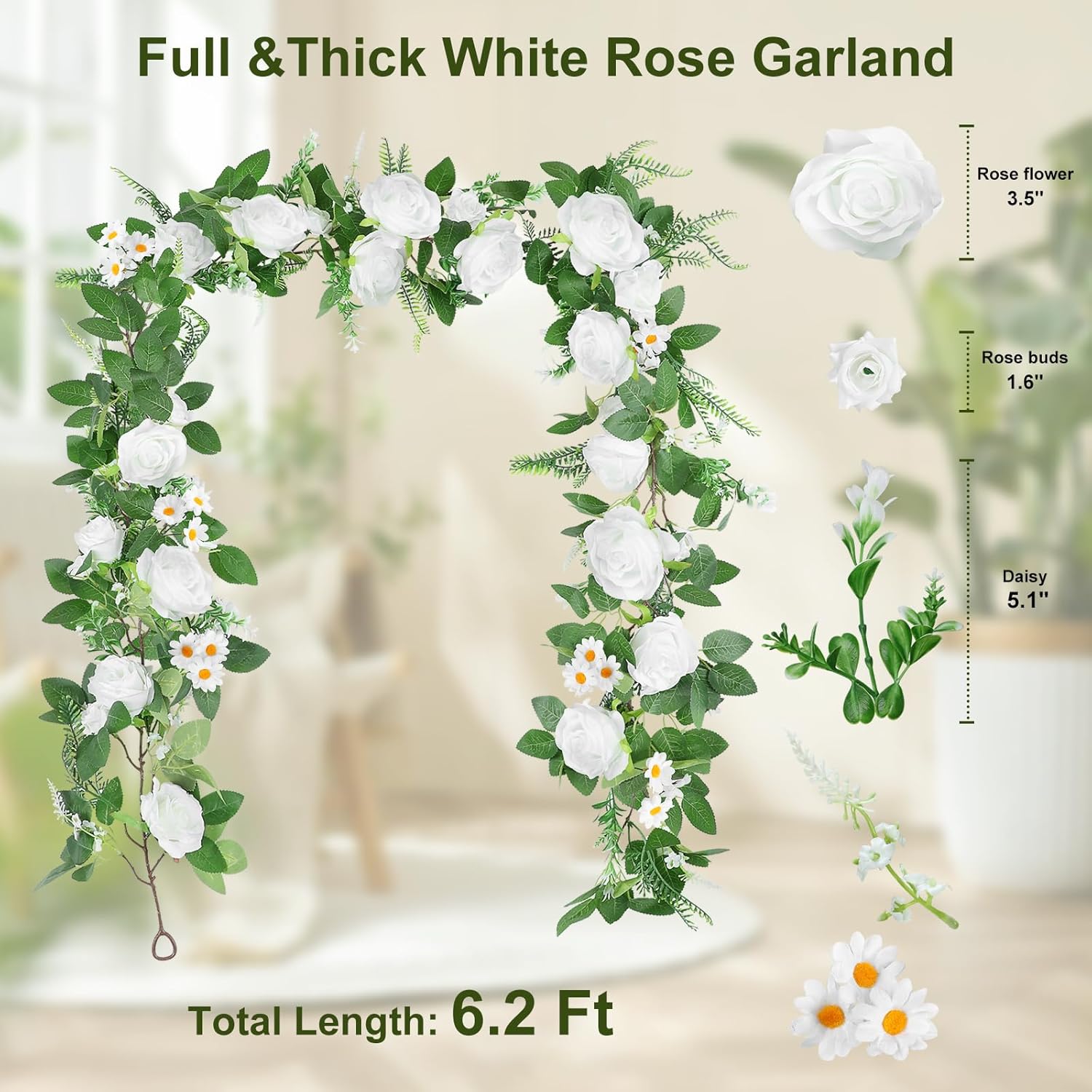 • [🌼Pretty White Flower Garland]: This rose garland is made up of richly sized 14 rose flowers and 8 buds, daisy, plentiful kinds of leaves. The white flowers and buds feature a stunning array of bright, elegant and holy; The rose vine leaves are full of luster, clear veins. The garland shape is very natural, vibrant and looks close to real. It adds a lively and dazzling spring touch to the season's decorations. A natural and realistic accent that radiates warmth and full of vigor.