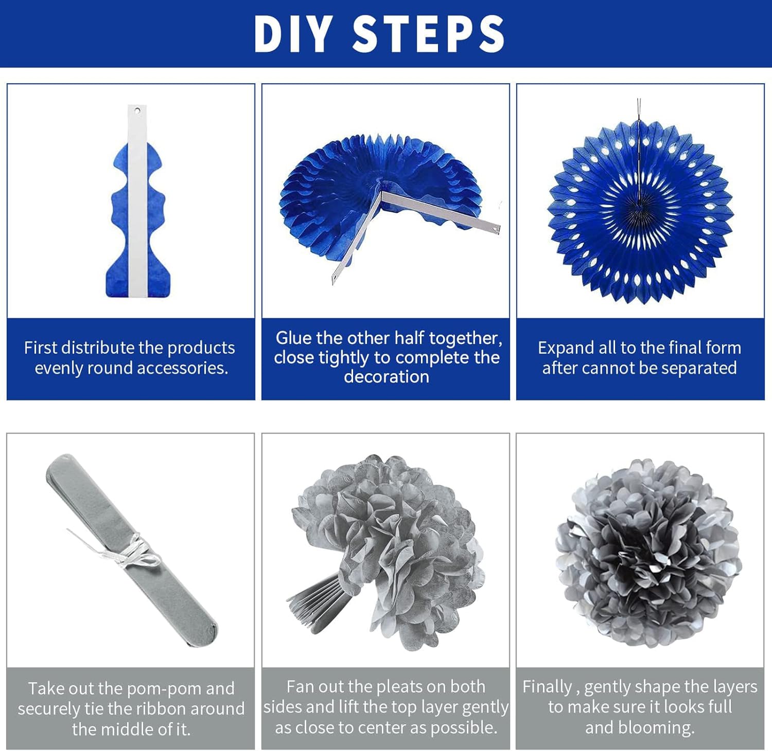 • 24PCS AT BEST PRICE: You'll get 6pcs paper fans, 4pcs paper hollow fans, 4pcs honeycomb Balls, 4pcs paper pom poms, 2pcs dots garlands, 1pcs pennant banner,1pcs HAPPY BIRTHDAY banner and 2 rolls of ribbon, 24pcs in total. Help you effortlessly create a beautifully unique party for your occasion.