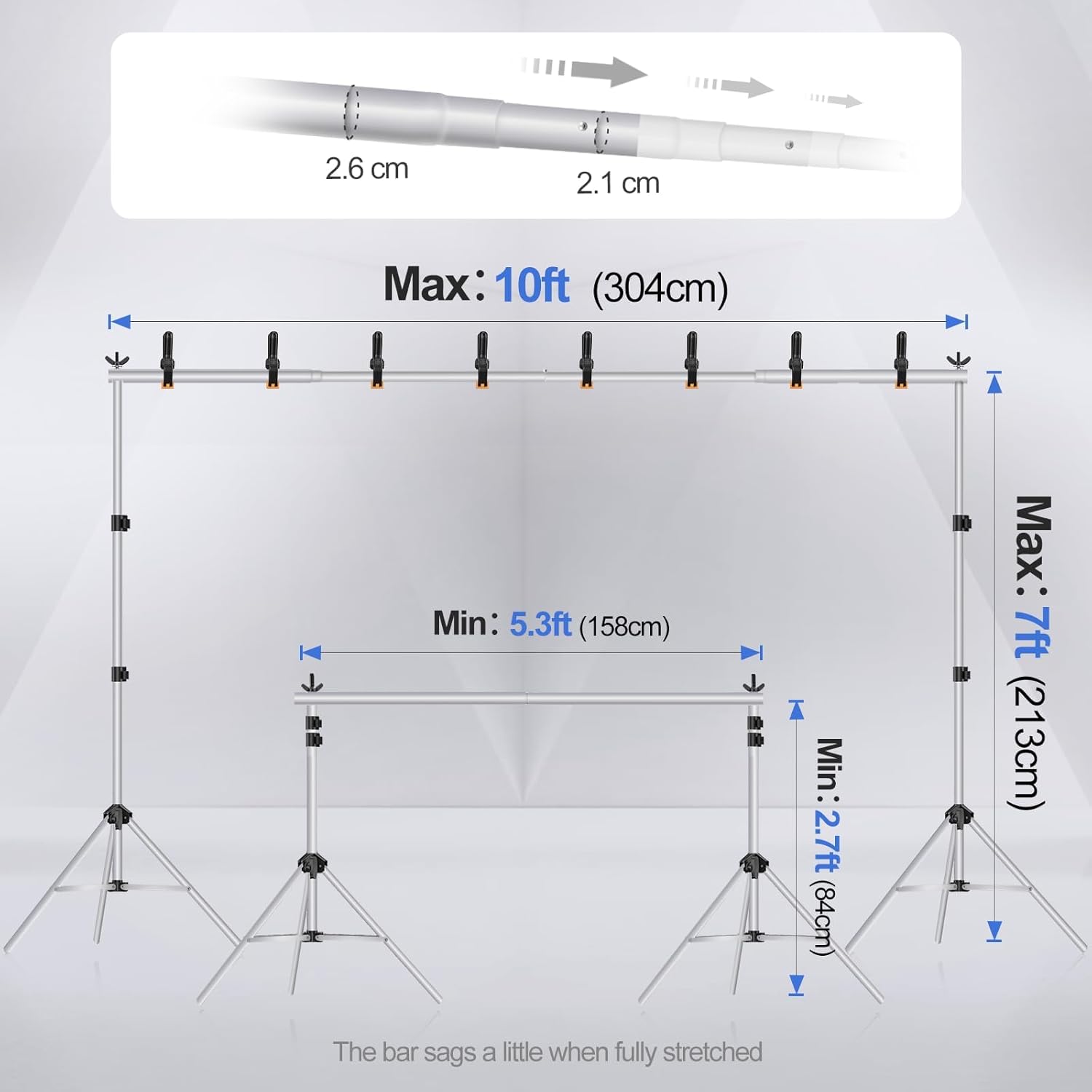 • 【Sturdy Tripod Backdrop Stand】 With adjustable height (2.6ft/0.8m–7.0ft/2.1m) , the aluminum alloy backdrop stand is durable, and the design of the tripod base ensures it won’t shake when fully extended to its maximum size.