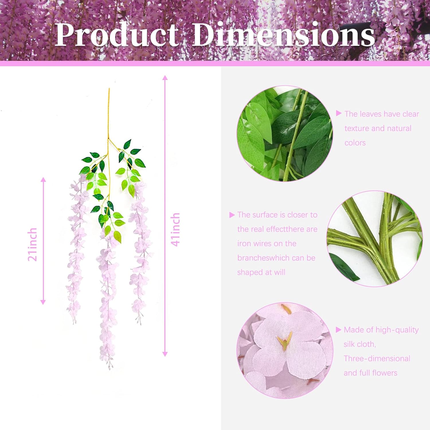 • 【Suitable for A Variety of Scenes】Pink wisteria floral garland have a purely natural pattern design, realistic and natural, suitable for decorating living rooms, bedrooms, study rooms, and windowsill places, so that your living space into the natural atmosphere, become more comfortable. At the same time, they are also suitable for decorating dinner parties, birthday parties, weddings, and other places, to create a warm atmosphere, so that your guests leave a good and unforgettable memory.
