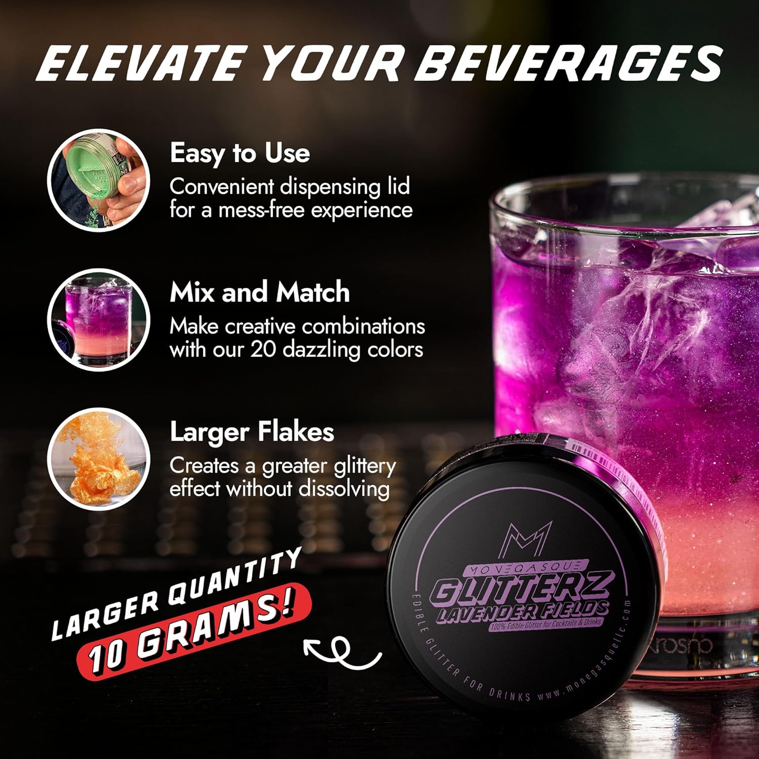 • PREMIUM EDIBLE GLITTER FOR COCKTAILS – Add a touch of glamour to your creations with MONÉGASQUE Glitterz. Perfect for cocktails, cakes, and more, our halloween glitter is flavorless and safe, crafted from mica-based pearlescent and food-grade colorants.