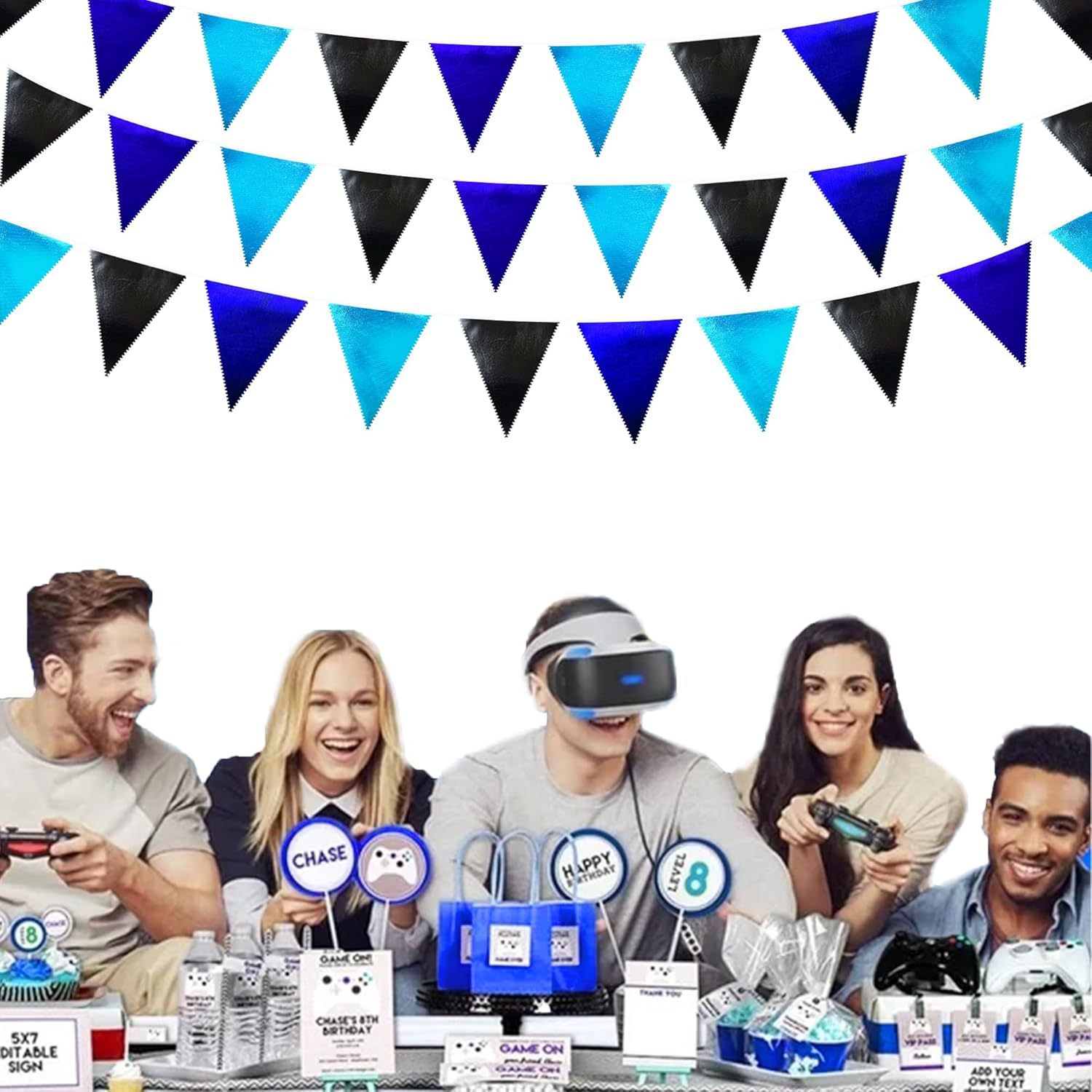 Black Blue Party Decorations Metallic Fabric Triangle Pennant Banner Flag Bunting Garland for Video Game Nautical Birthday Graduations Retirement Wedding Bachelorette Outdoor Holiday Party Supplies