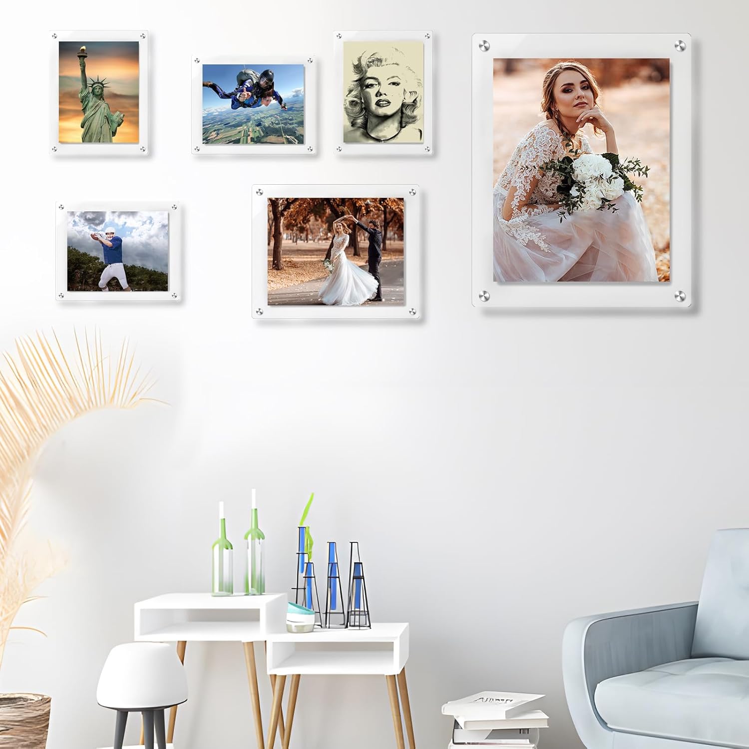 • Magnetic picture frame:Our frame consists of 2 acrylic sheets with magnets,strong magnets attached two acrylic sheets together and separate the two sheets to place photos.Make it very easy to change photo without taking off the frame from the wall