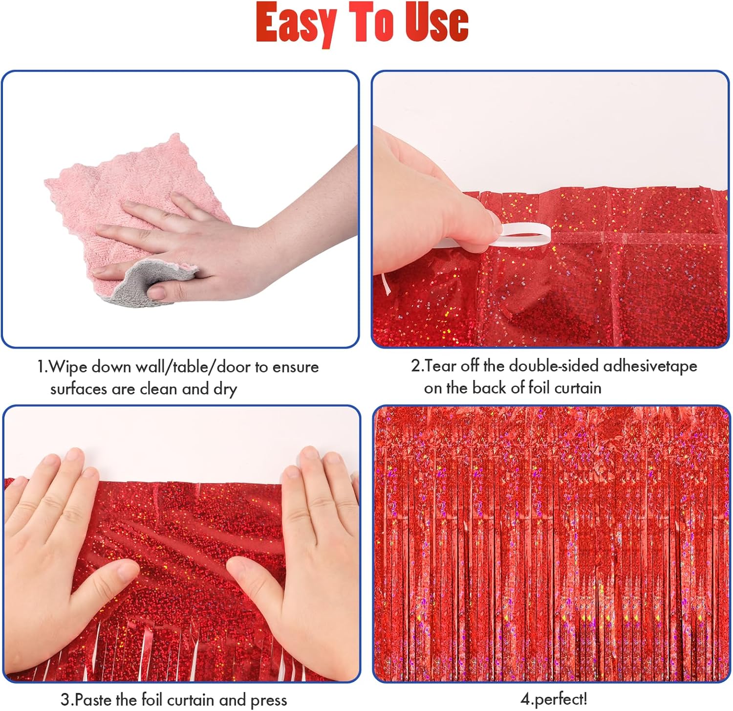 • 🎉SAFE & SHINY MATERIAL- This Glitter red tinsel backdrop is made of high-quality shiny tinsel, non-toxic, odorless, and non-fading, safe for families with children and pets. Just transform your home into a shining streamers happy birthday decorations, and enjoy the party.