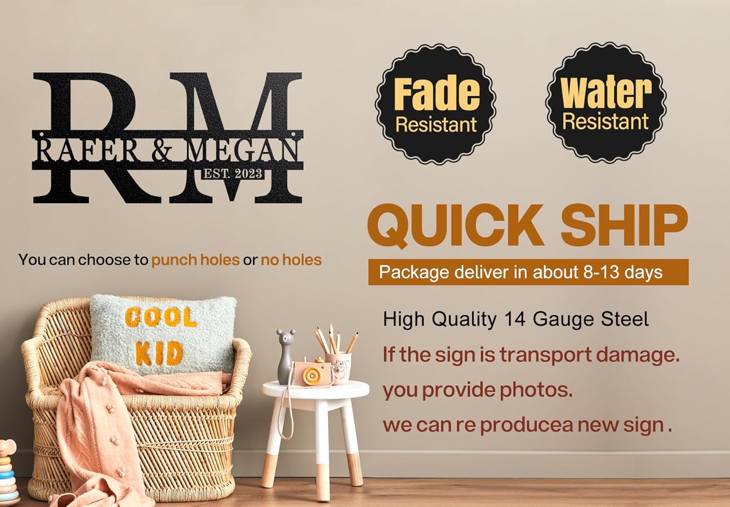 • HIGH-QUALITY CRAFTSMANSHIP: Our Personalized Last Name sign is Cut from heavy-duty grade 14 steel (0.08 inches thick). Heavy duty grade 14 steel will not be as thin as grade 16 and grade 18 steel, with a smooth surface and durability,These name signs will not flex nor break like products made of inferior materials.Your personalized metal sign used powder coated to give a smooth finish and long term durability